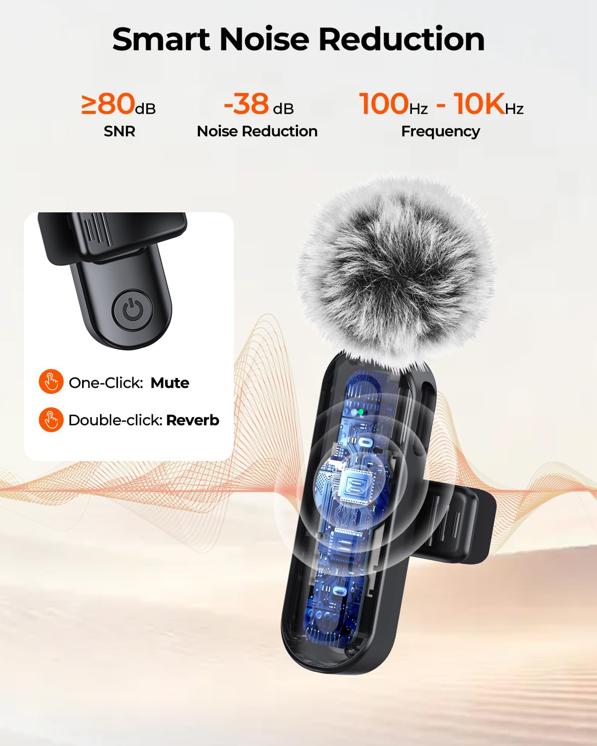 Noise Cancellation & Clear Voice: PQRQP clip on microphone wireless uses a mini microphone design. The wireless mic advanced AI technology effectively reduces background noise and wind interference, ensuring your voice remains crisp and clear in any challenging environment.