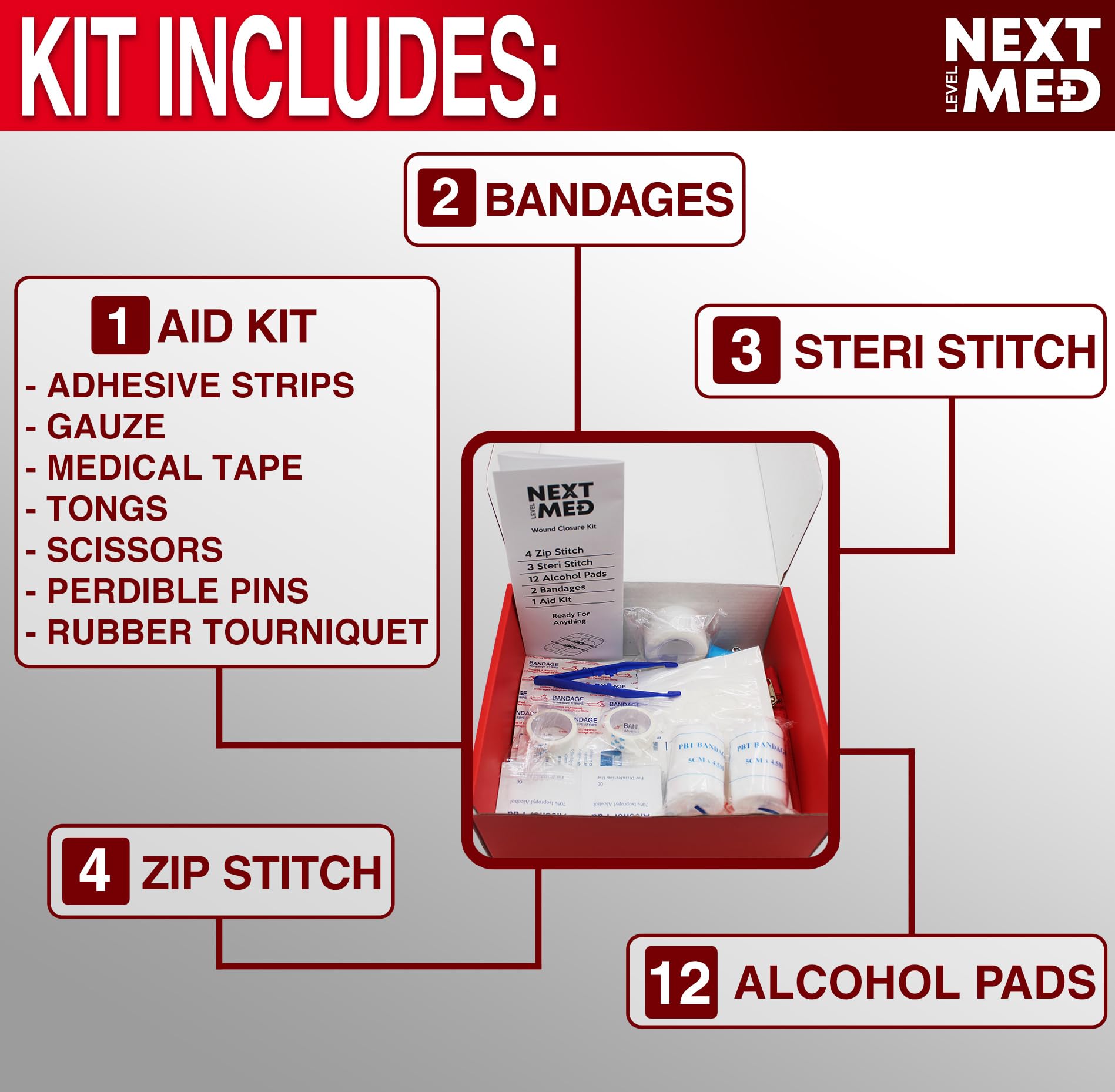 Package Includes: 4 Zip Stitch (6*6cm), 3 x Steri Stitch (2cm), 12 x Alcohol Pads (3*3cm), 2 x Non-Woven Bandages (8*10cm), *1 x Aid Kit