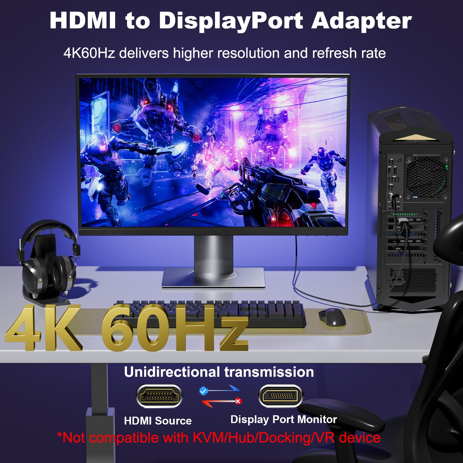 【Widely Compatible with Mainstream Devices, Plug and Play】The HDMI to Display Port adapter effortlessly connects your PS5/4/3, Xbox One/Series X/S/360, MacBook Pro, mainstream laptops, or desktops with HDMI ports to DisplayPort enabled monitors, HDTVs, and other display devices featuring DisplayPort ports. No drivers required true plug and play functionality delivers an efficient and convenient connectivity solution for office work, entertainment, and gaming