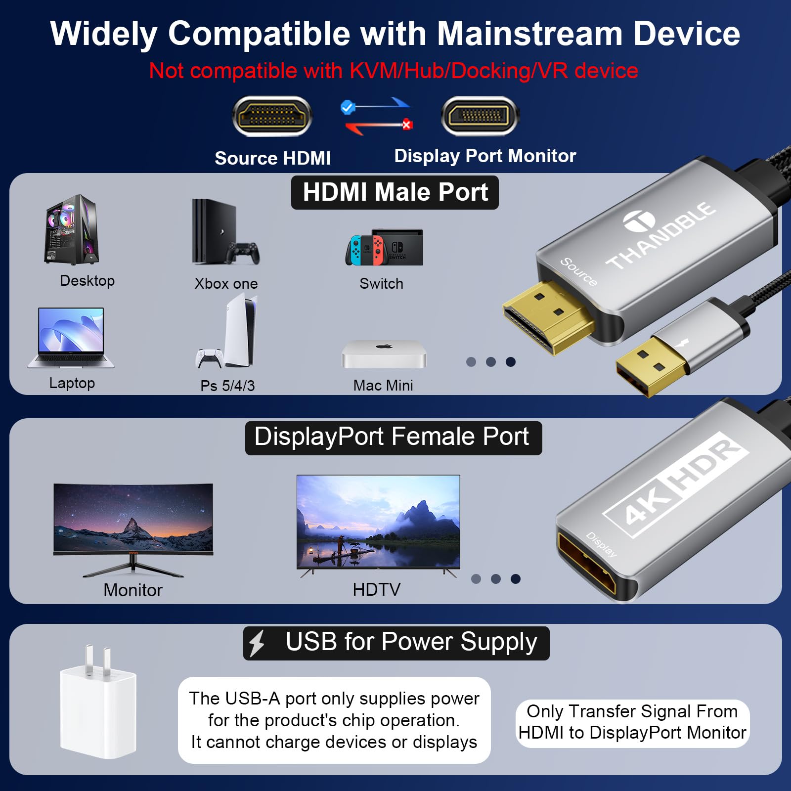 【Usage Assurance】To ensure stable transmission of 4K HD video quality, always connect the included USB cable to power the built-in chip. Utilizing advanced IC chips for signal conversion effectively prevents issues like screen flickering, ghosting, or audio-video desynchronization. THANDBLE offers 12-hour rapid response service and professional technical support. If you have any questions regarding the use of the HDMI to DP cable, please contact us promptly