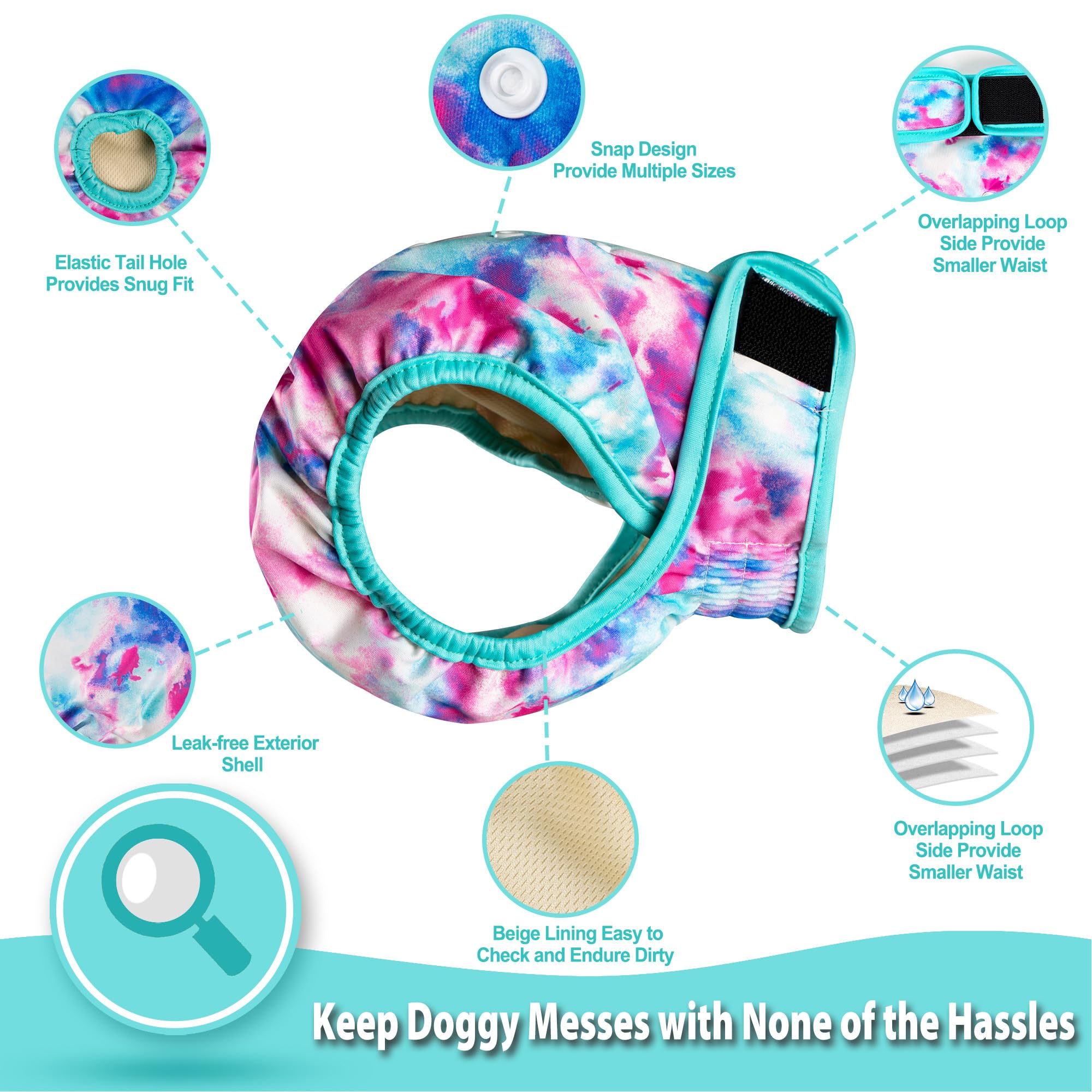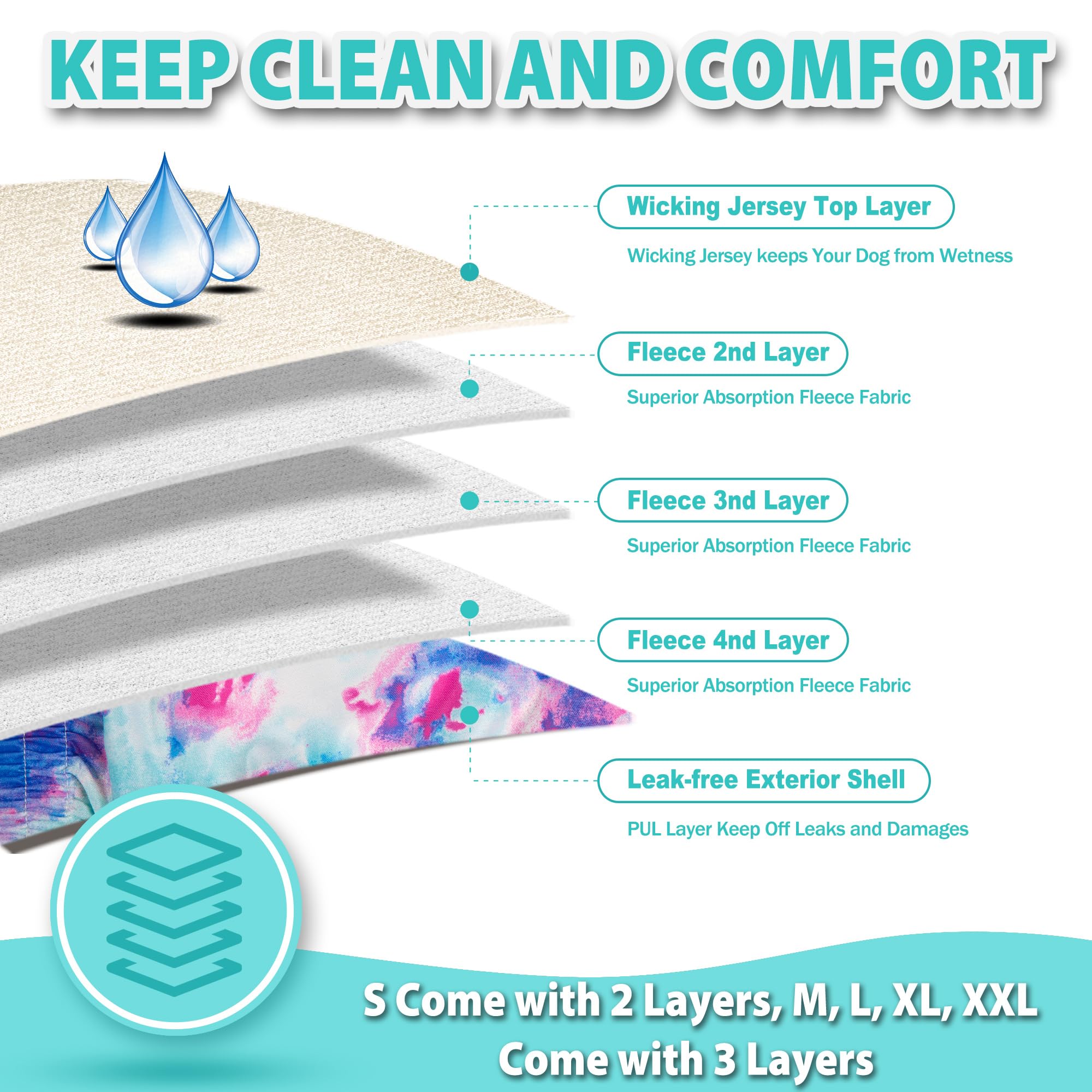 Absorbent & Leak-free Materials - The reusable female dog diaper inner layer is made of soft and breathable beige color wicking jersey, perfect to keep the dog from wetness. The 3 middle layers are made of highly absorbent fleece to absorb the liquid and stop any leaks.The diaper outer layer, with attractive and fun designs, is made of smooth and soft-to-touch leak-free TPU material to keep the floor or bed dry and clean.