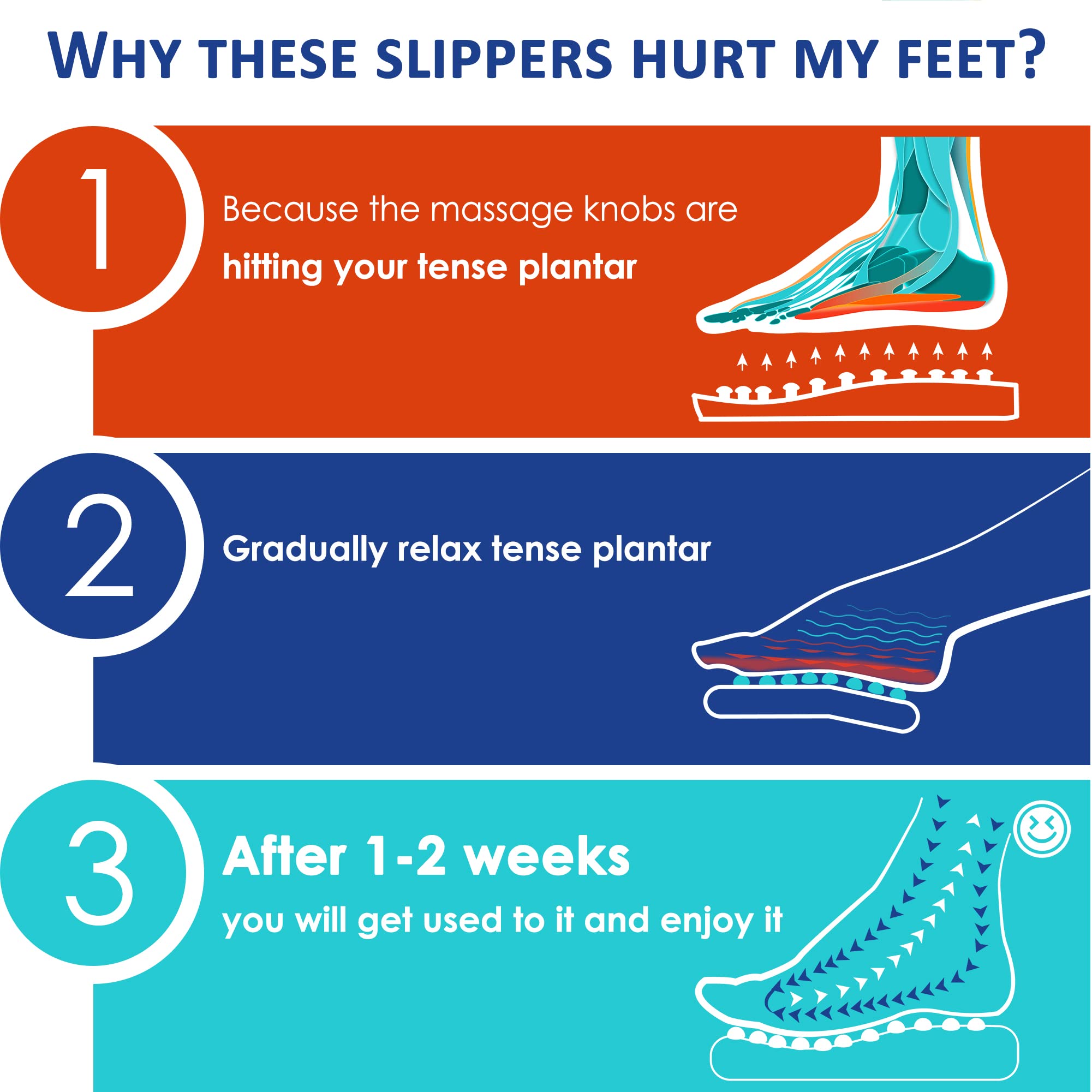 ✔PAINFUL SANDALS: When you first start wearing these therapeutic massage slippers, you may experience a lot of pain. Because the massage knobs are stretching the tense plantar muscles. Please add socks and wear 3-5 minutes a time to start, it will take 1-2 weeks to get used to it gradually.