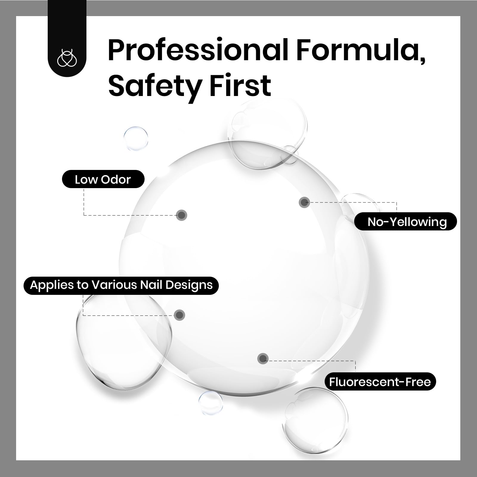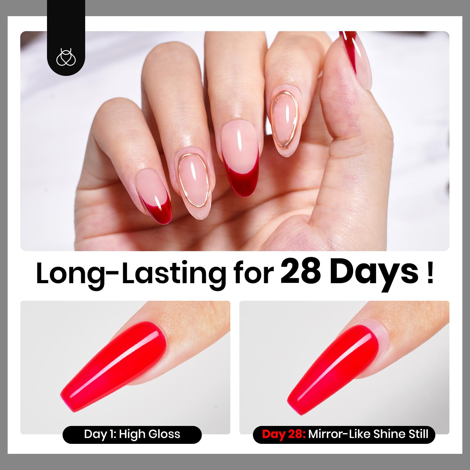 Ultra-Bright and Durable for 28 Days: This top coat bulk delivers a mirror-like brightness and provides long-lasting color protection. There's no need to wipe off the top coat, reducing the number of steps and improving efficiency. The gloss effect lasts for 28+ days. Tips: Avoid touching your nails after curing the top coat for 2 minutes to enhance the shine.
