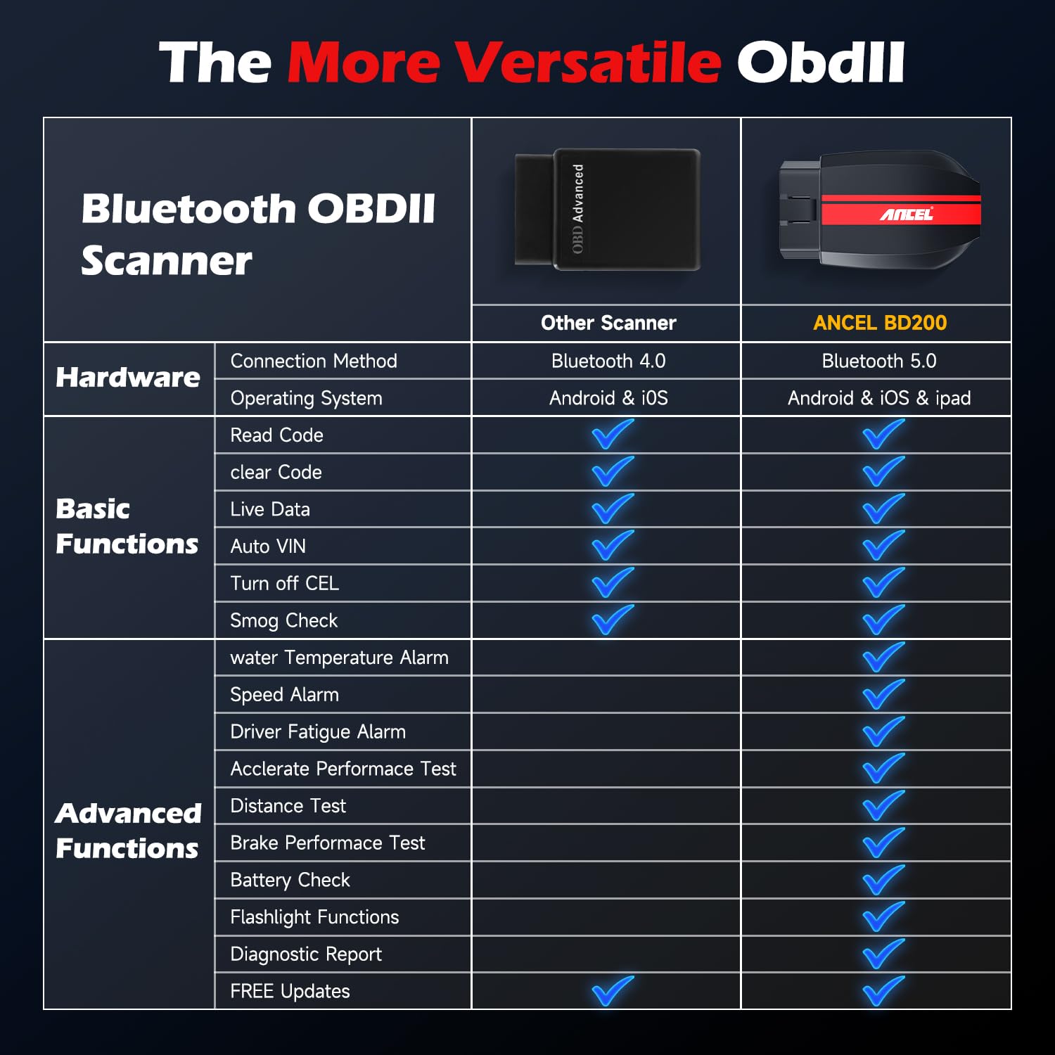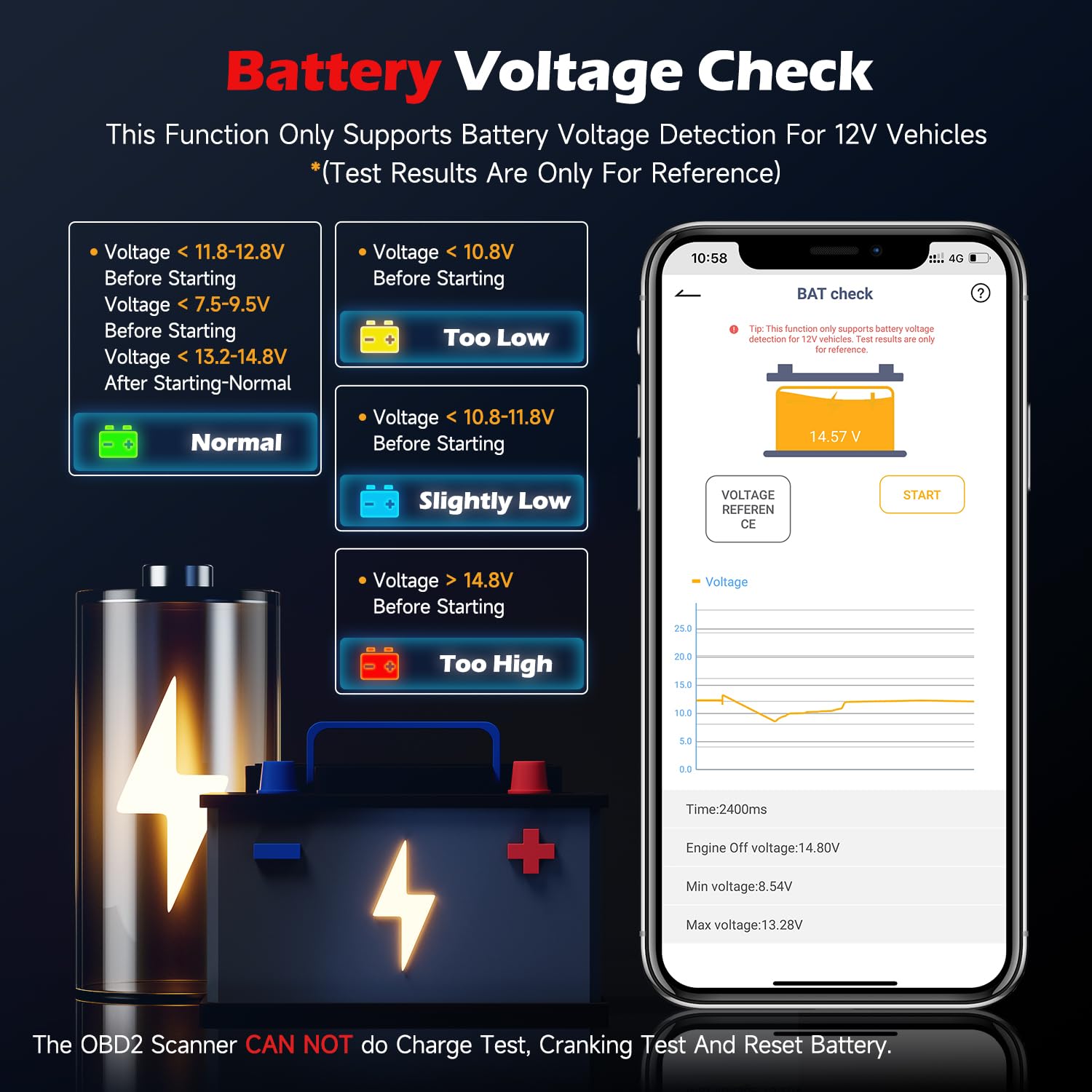 đăTEST BATTERY VOLTAGEăWhen your car can't start normally, there may be a problem with the car battery. The obd2 scanner bluetooth can detect the battery voltage in real time and display the results in the form of charts to help you understand the health of the battery and replace it with a new one in time to avoid the car can't start normally in winter. đTIPS: The obd2 scanner CAN NOT do charge test, cranking test and reset battery.