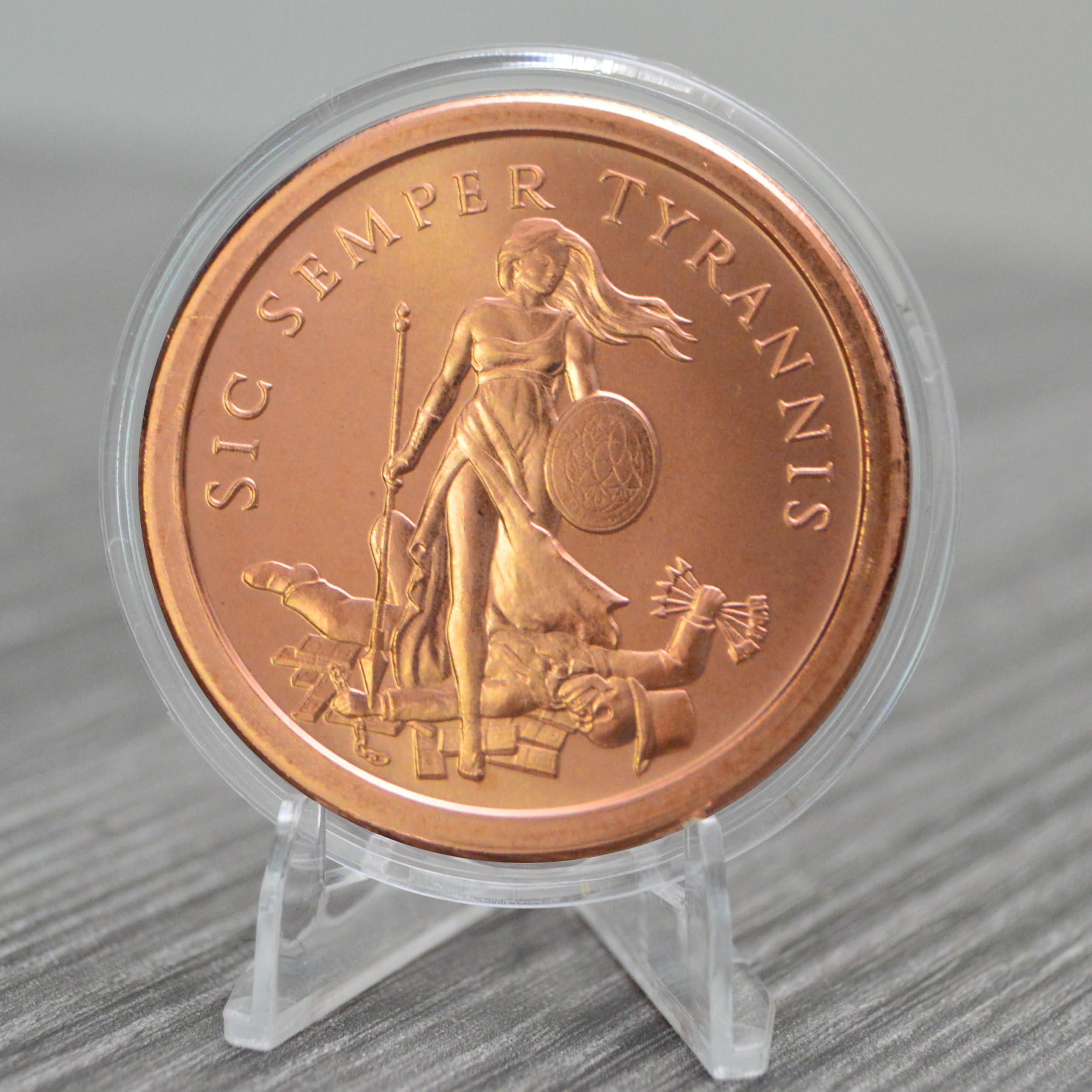 Delve deep into historical significance with the Sic Semper Tyrannis 1 oz Pure .999 Copper Medallion. This medallion encapsulates the powerful message, "Thus Always to Tyrants", the renowned motto of the State of Virginia. Often viewed as a proclamation of resistance against oppression and a nod to the everlasting fight for liberty, this emblem resonates with those who value freedom and just governance. Crafted in the USA with impeccable attention to detail, this medallion is composed of an AVDP ounce of .999 pure copper, merging intrinsic worth with historical resonance. Beyond its tangible value, the piece stands as an enduring testament to the struggles against tyranny and the undying spirit of liberty. For lasting protection against wear and potential damage, each medallion is encased in a safeguarding capsule. Accompanying this medallion is a Certificate of Authenticity (COA) by Heavenly Metals, vouching for its purity, weight, and provenance. This certification upholds the value of your investment. The Sic Semper Tyrannis 1 oz Copper Medallion is not just a piece of metal, but a profound statement of resistance, making it a coveted asset for collectors and history enthusiasts alike.
