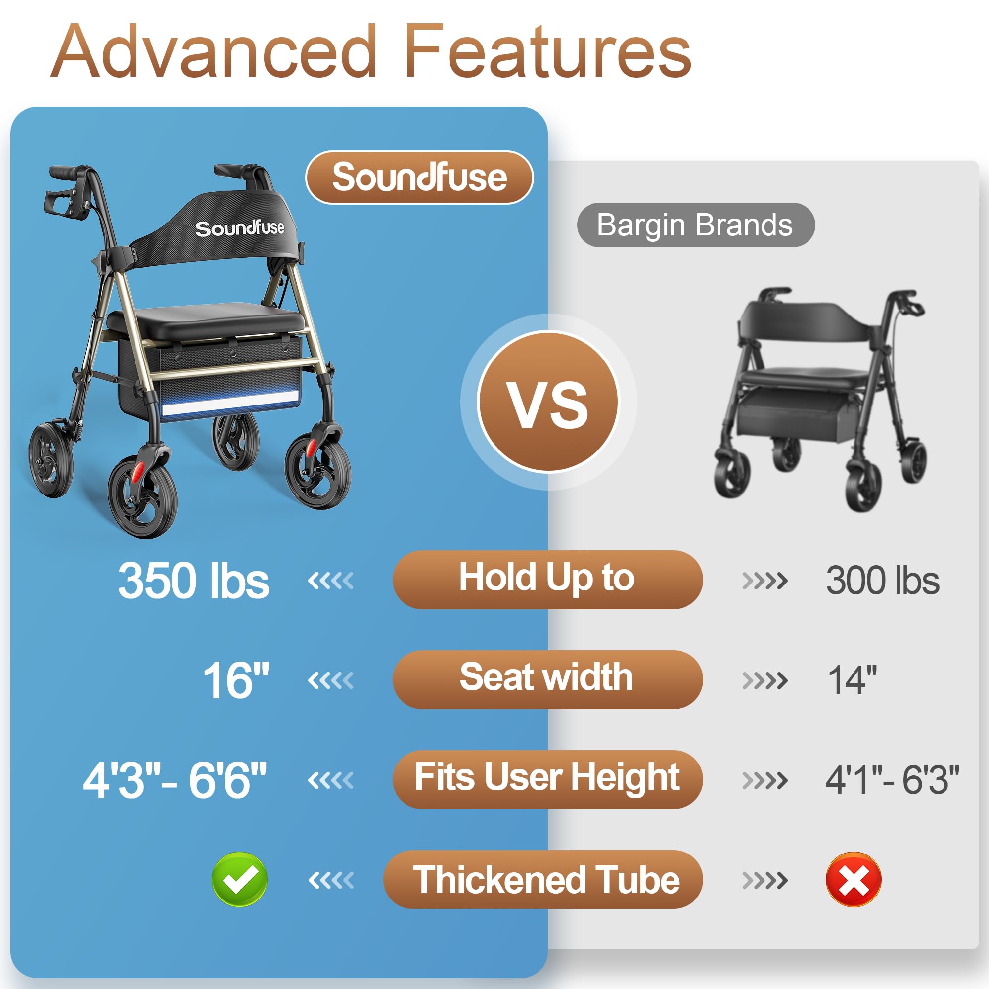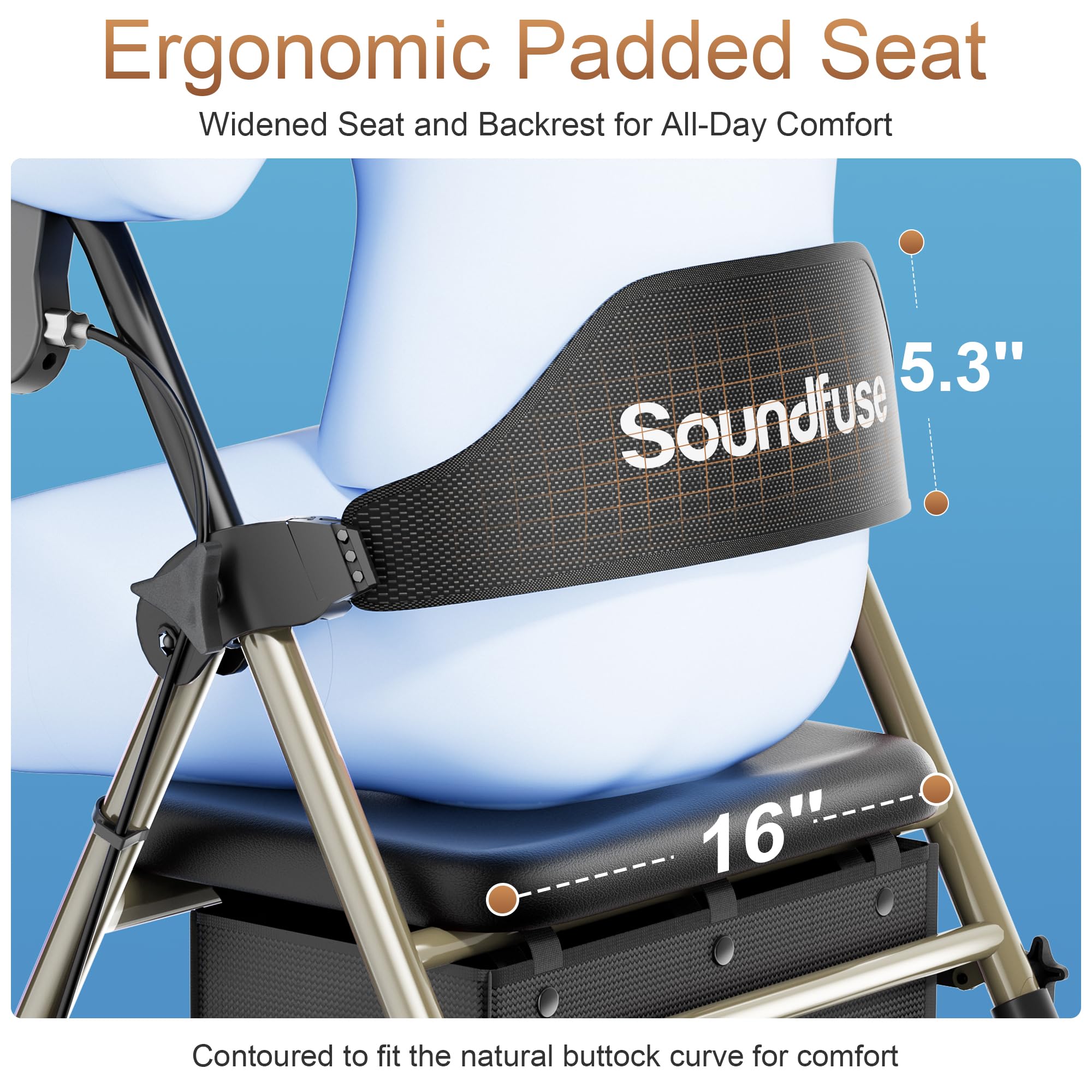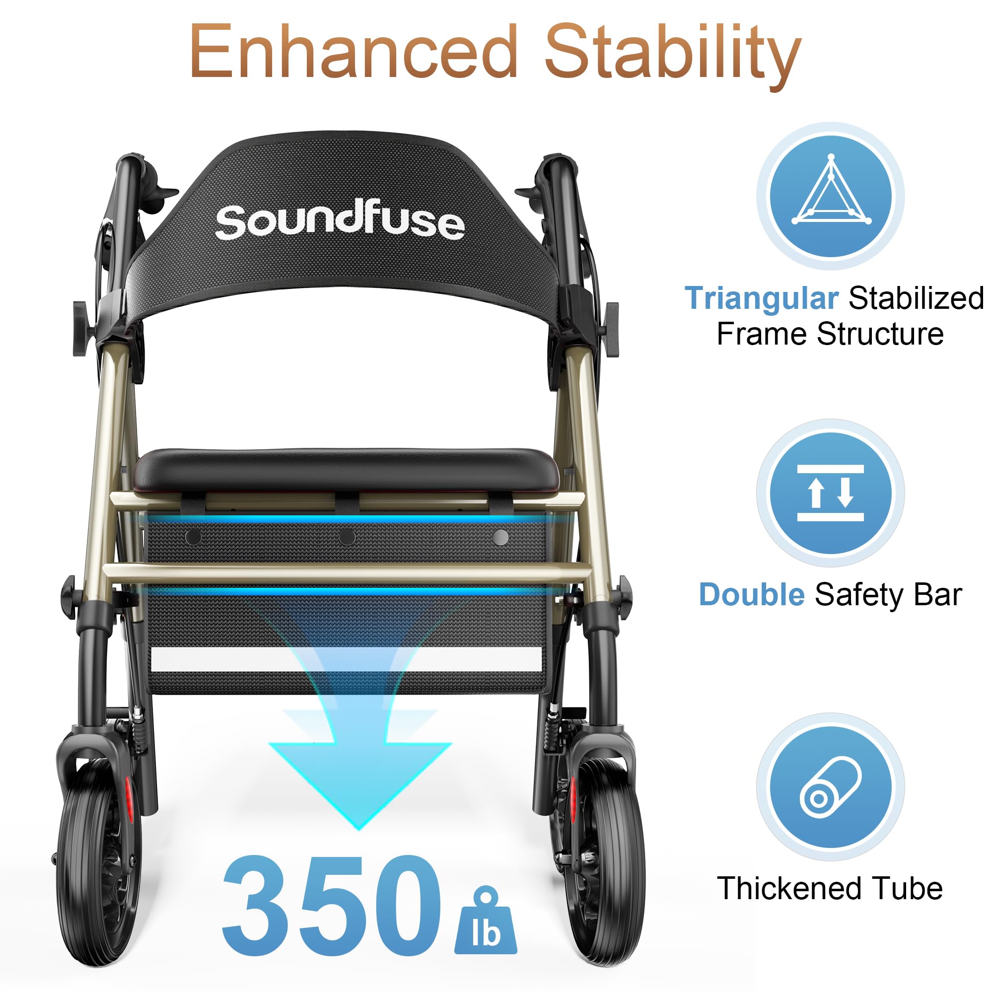 Stable & Durable - Featuring a reinforced triangular frame and double crossbar support, Soundfuse rollator walker with seat boasts a weight capacity of up to 350 lbs. Its thickened tubes ensure enhanced strength and durability, guaranteeing stability with every step