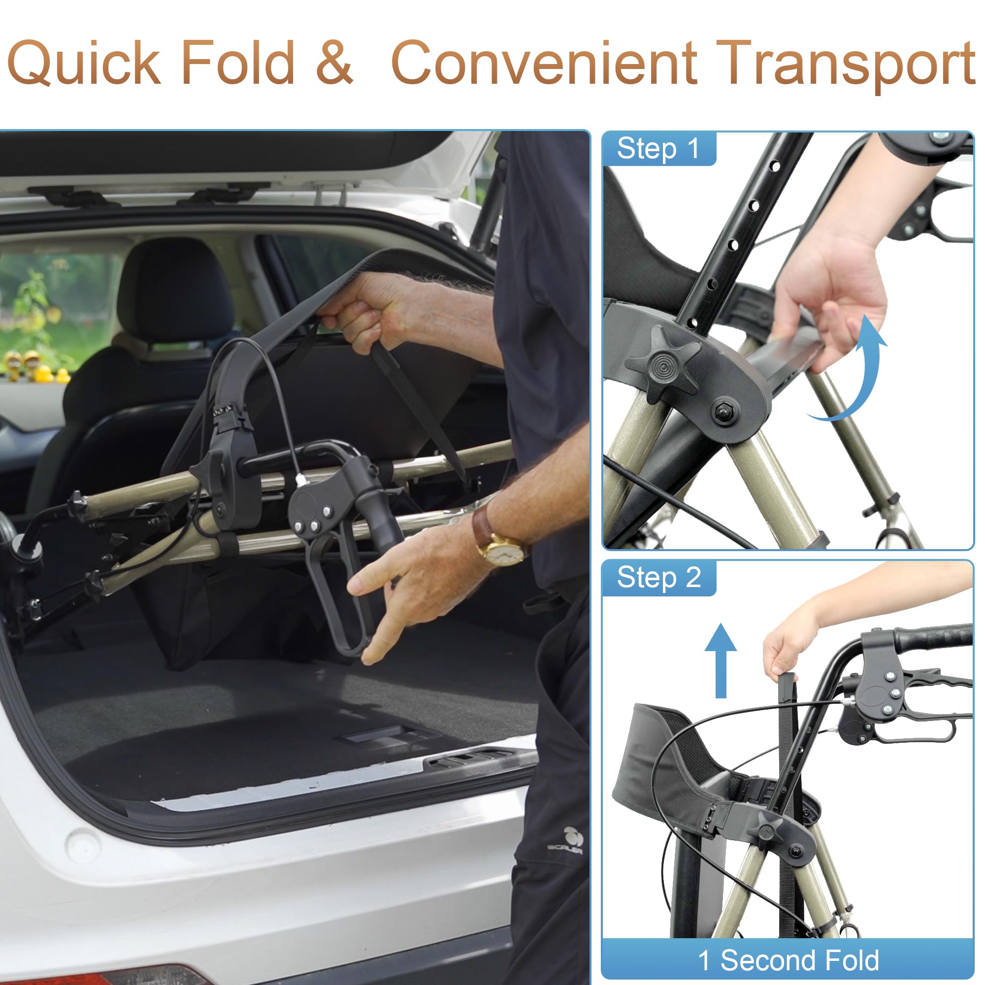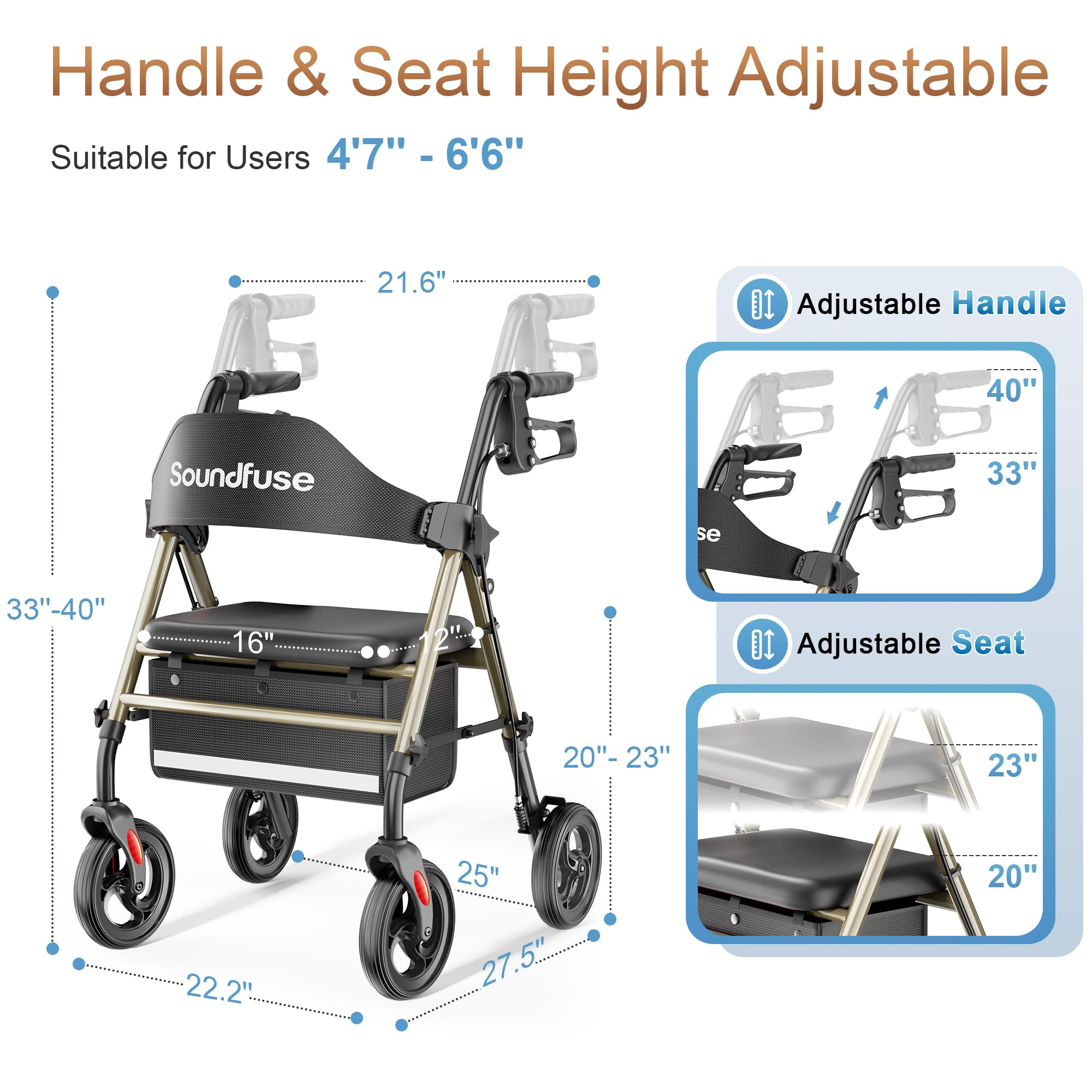Dual Height Adjustment & Foldable - Our rollator walker suitable for people of various heights (4'7'' -6'6'') via unique dual adjustment design. The seat can be adjusted from 20" to 23" and the handle can be adjusted from 33" to 41", allowing you to find most comfort height. Weighs 20.4 lb, our rolling walker with seat features a quick-fold design, making it easy to transport and store in the car trunk