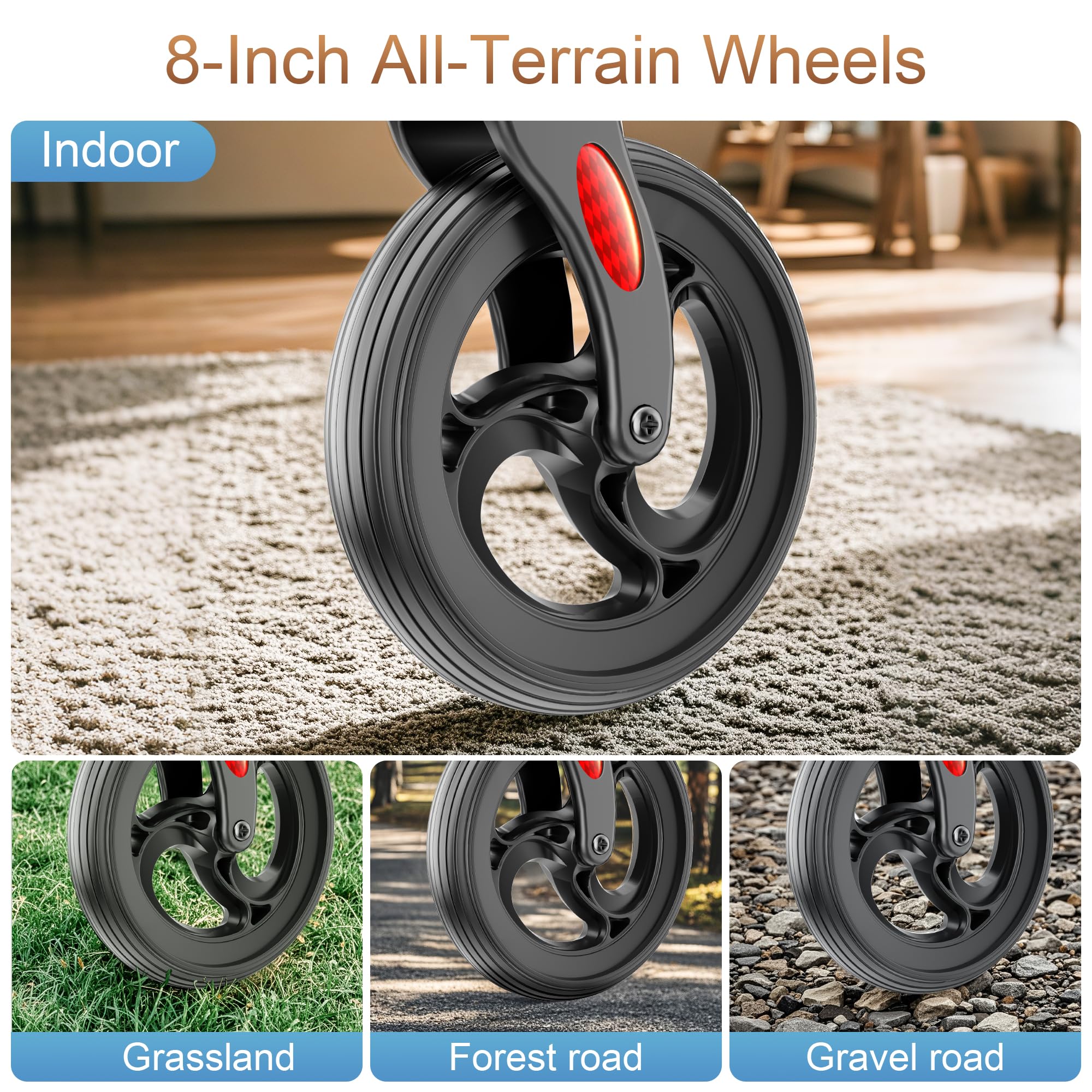 For All Terrains - Our 4 wheel walker is equipped with premium 8'' wheels, with its superior obstacle-surmounting ability and better grip, making it easy to handle bumps and various terrains, and even maintaining stable walking on slippery ground