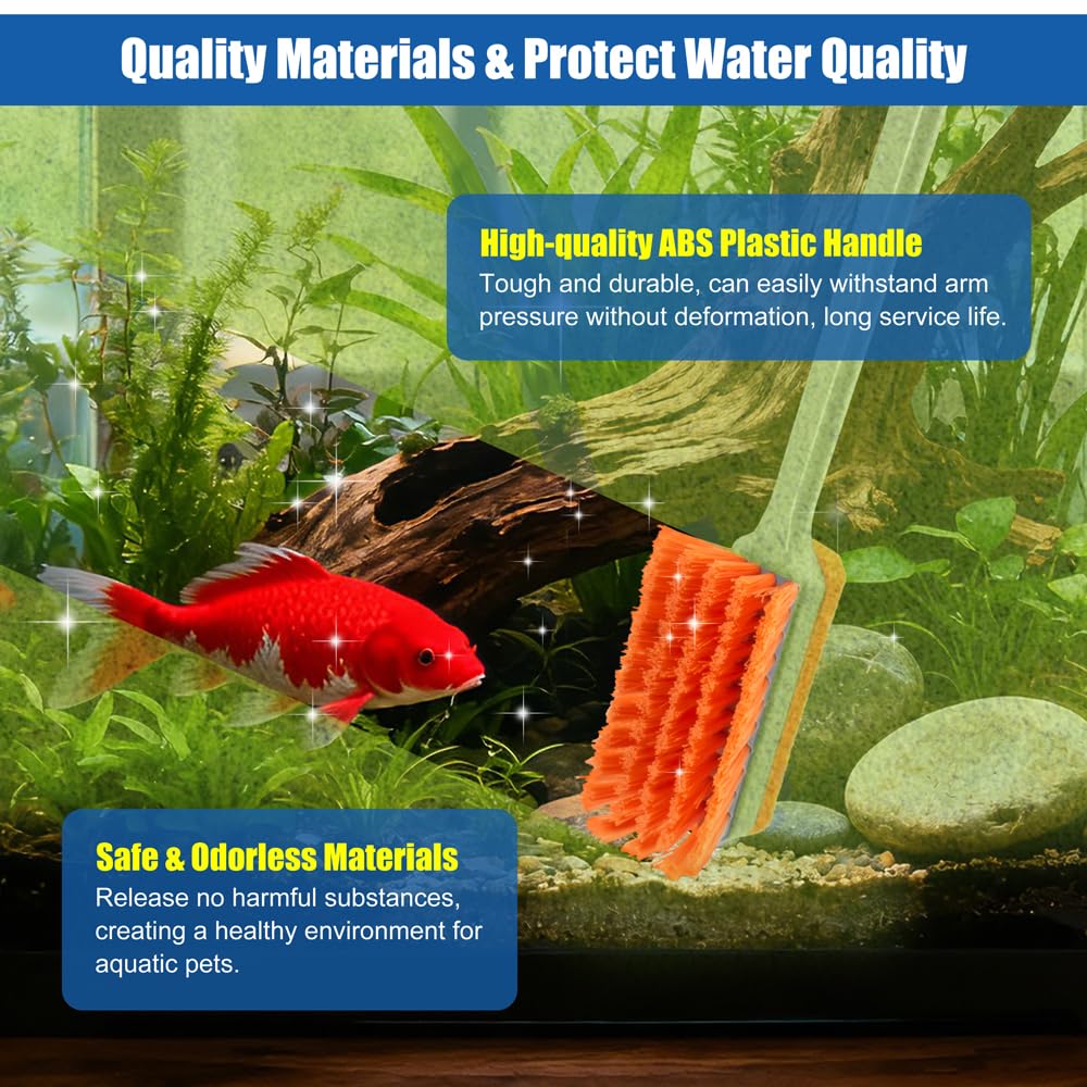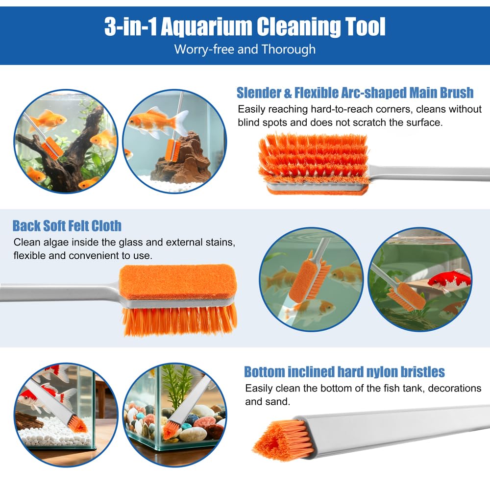 【3-in-1 Aquarium Cleaning Tool】: The arc-shaped main brush is slender and flexible, easily reaching hard-to-reach corners. It cleans without blind spots and does not scratch the surface. The soft felt cloth on the back is used to clean algae inside the glass and external stains, which is flexible and convenient to use. The bo ttom inclined hard nylon bristles can easily clean the bottom of the fish tank, decorations and sand, making the aquarium cleaning worry-free and thorough.