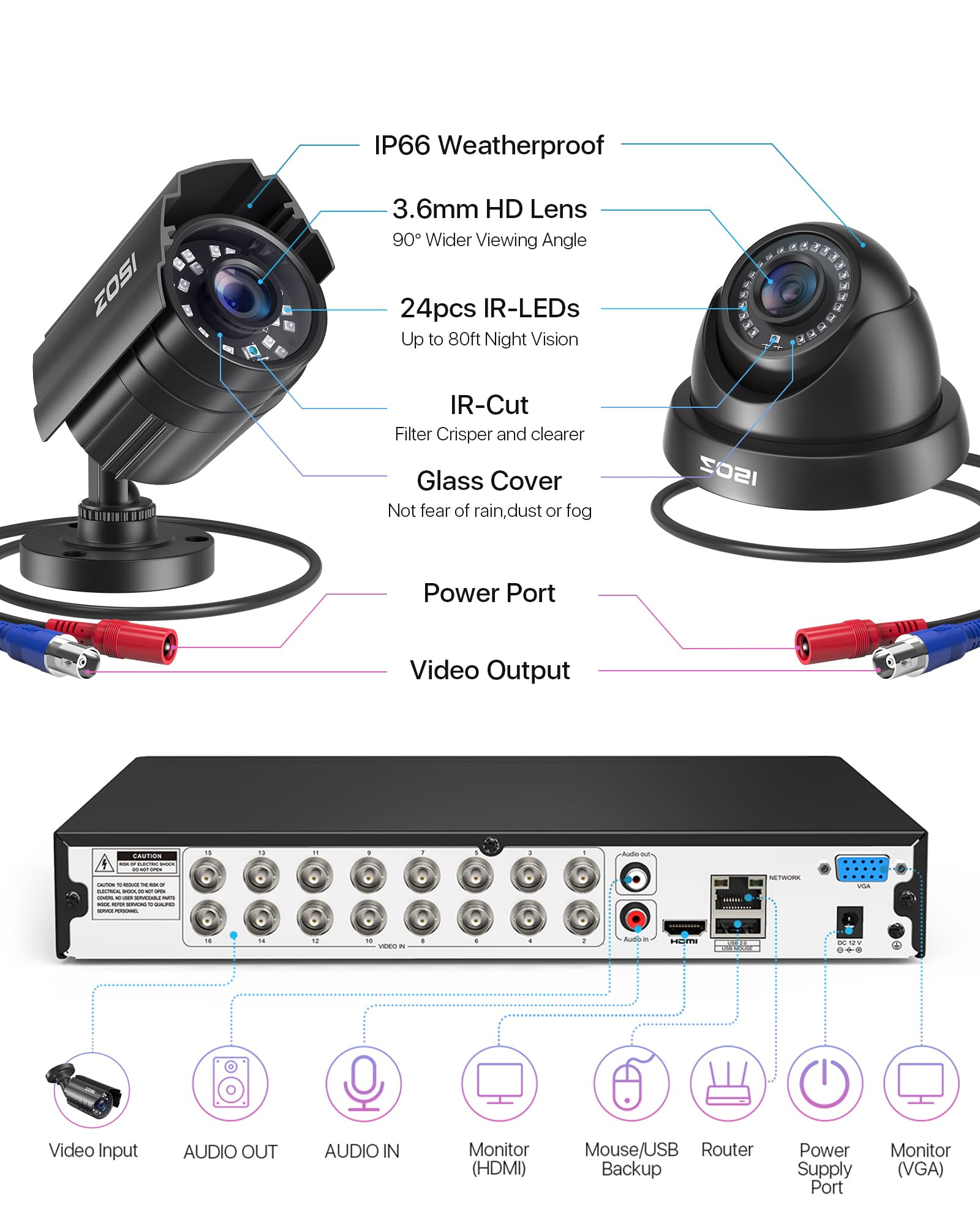 [IP66 Weatherproof & 80ft Night Vision] -Engineered with heavy-duty weatherproof housing,these surveillance cameras deliver all-weather durability for 24/7 outdoor/indoor protection. Advanced infrared technology provides crystal-clear night vision up to 80ft in pitch darkness, extending to 130ft with ambient light – ensuring complete property monitoring day and night.