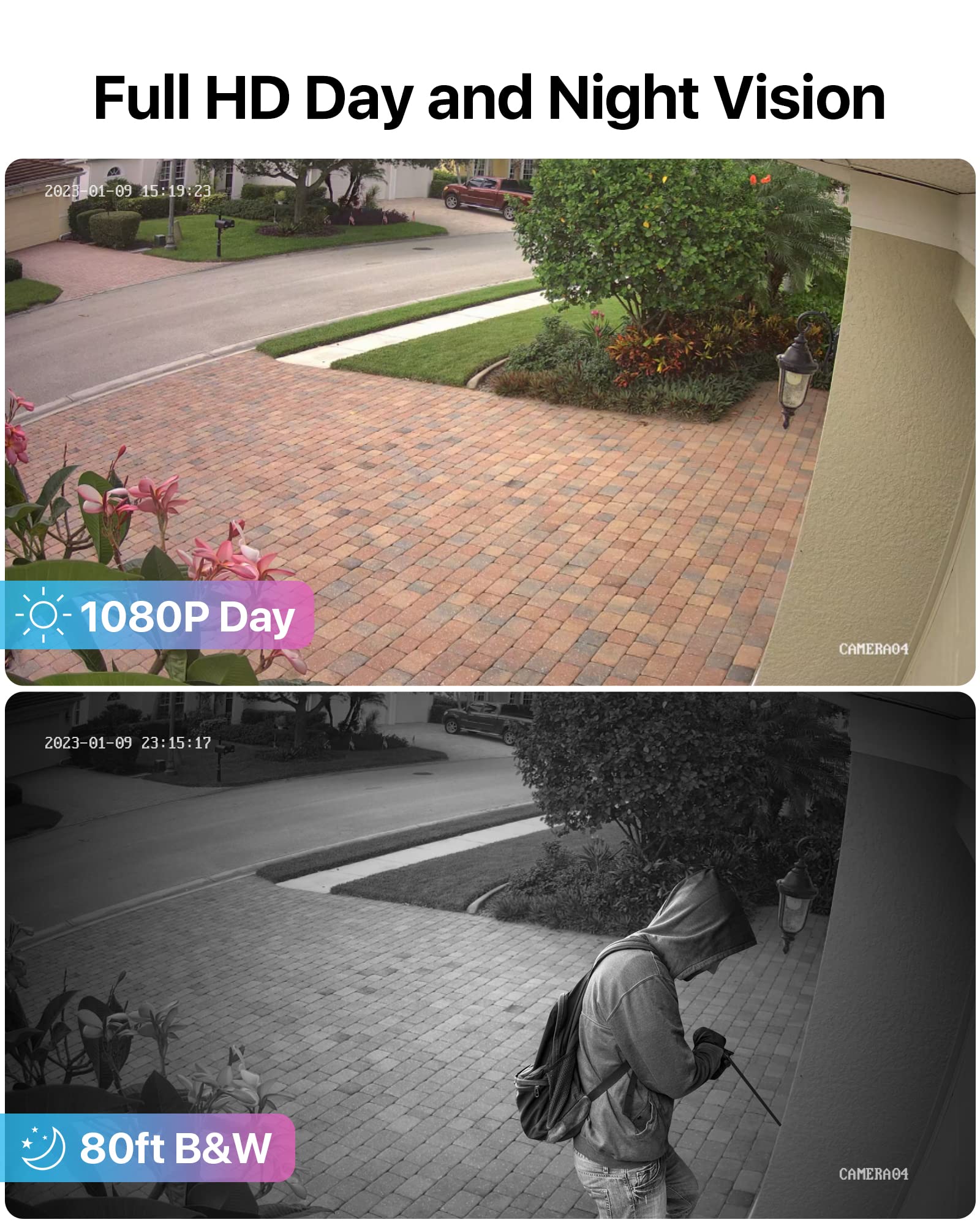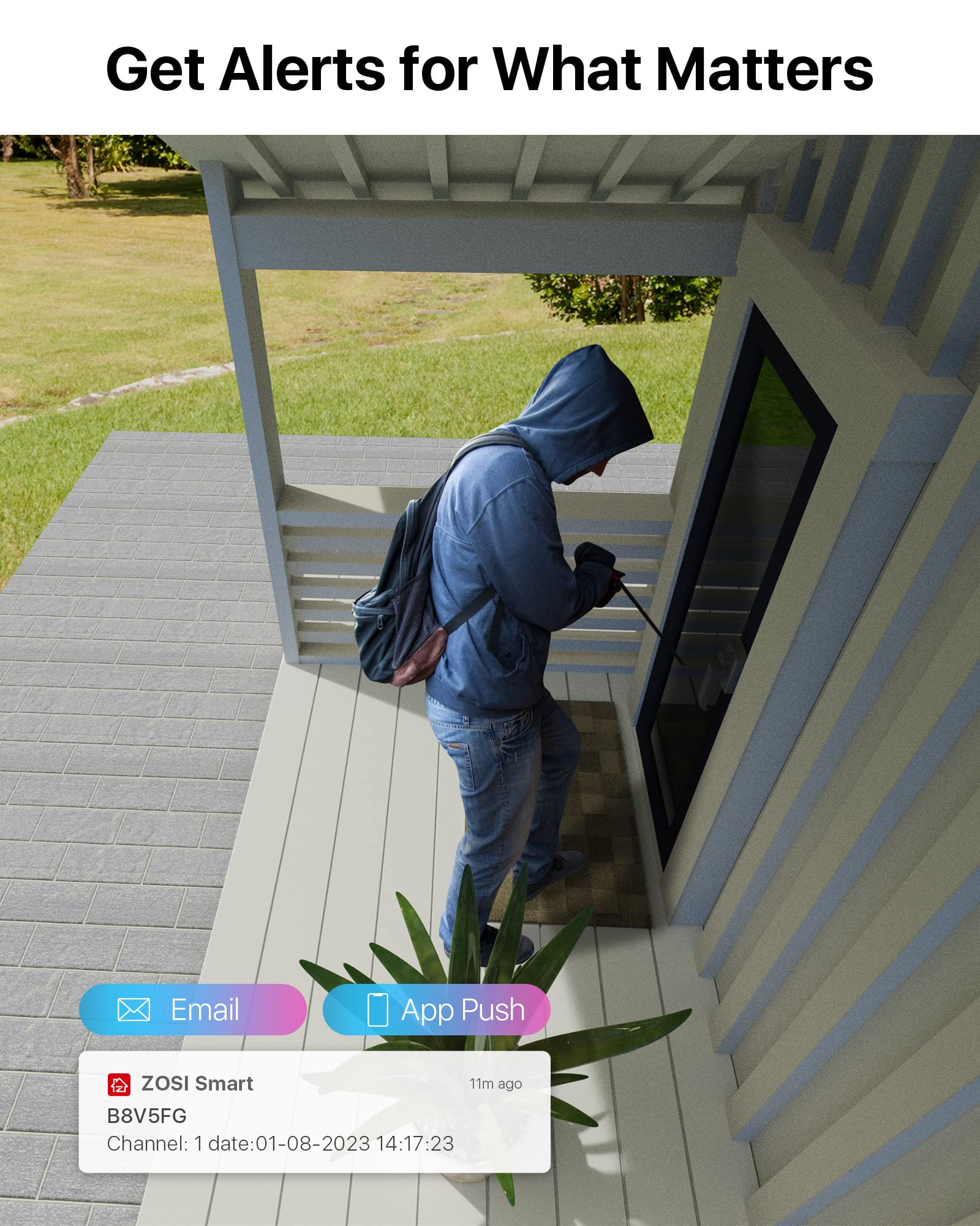 【Person & Vehicle Detection & Smart Alerts】-The camera precisely detects people and vehicles, being smart enough to distinguish them from other objects, thus safely reducing unwanted notifications. You will receive instant App push notifications, email alerts when motion events are detected.