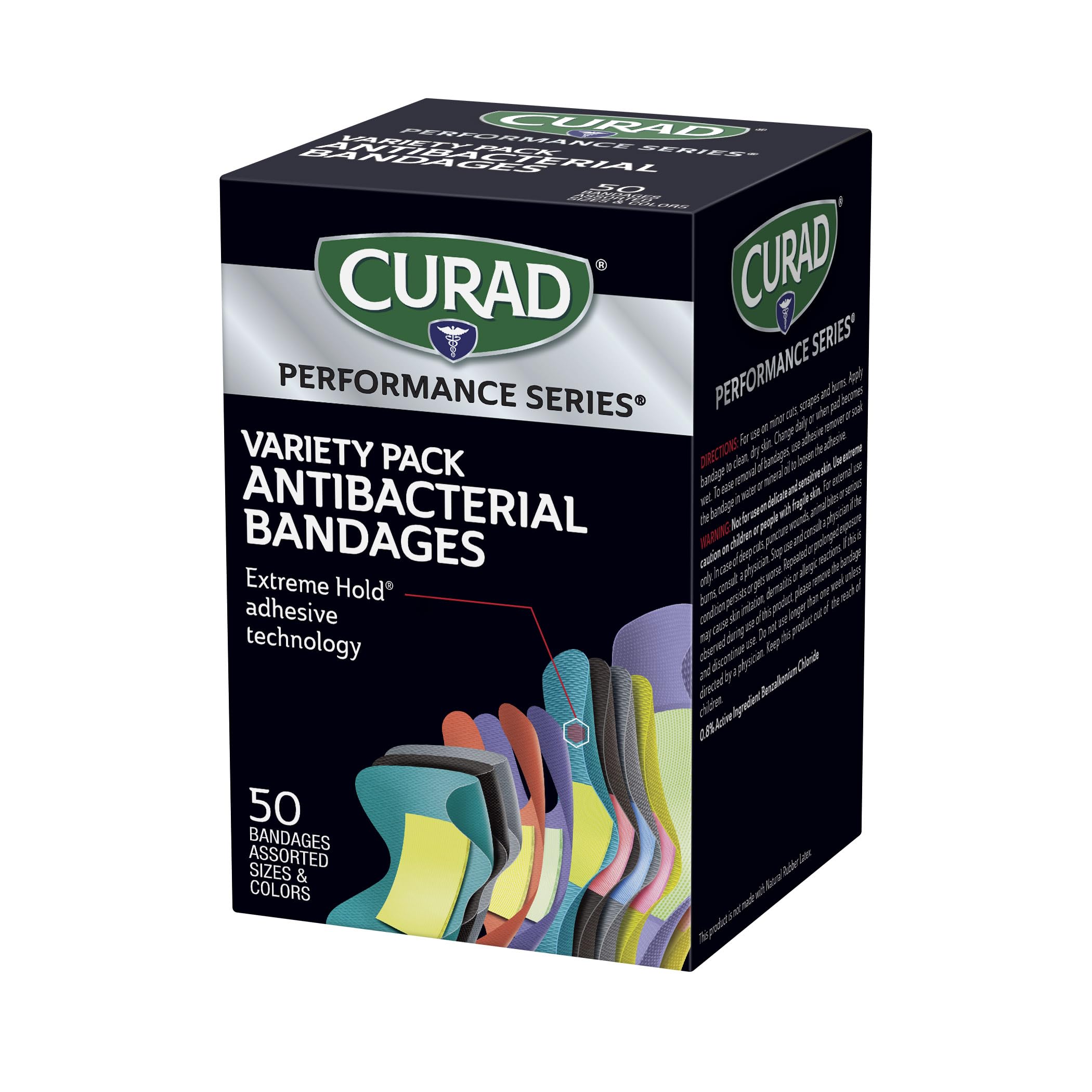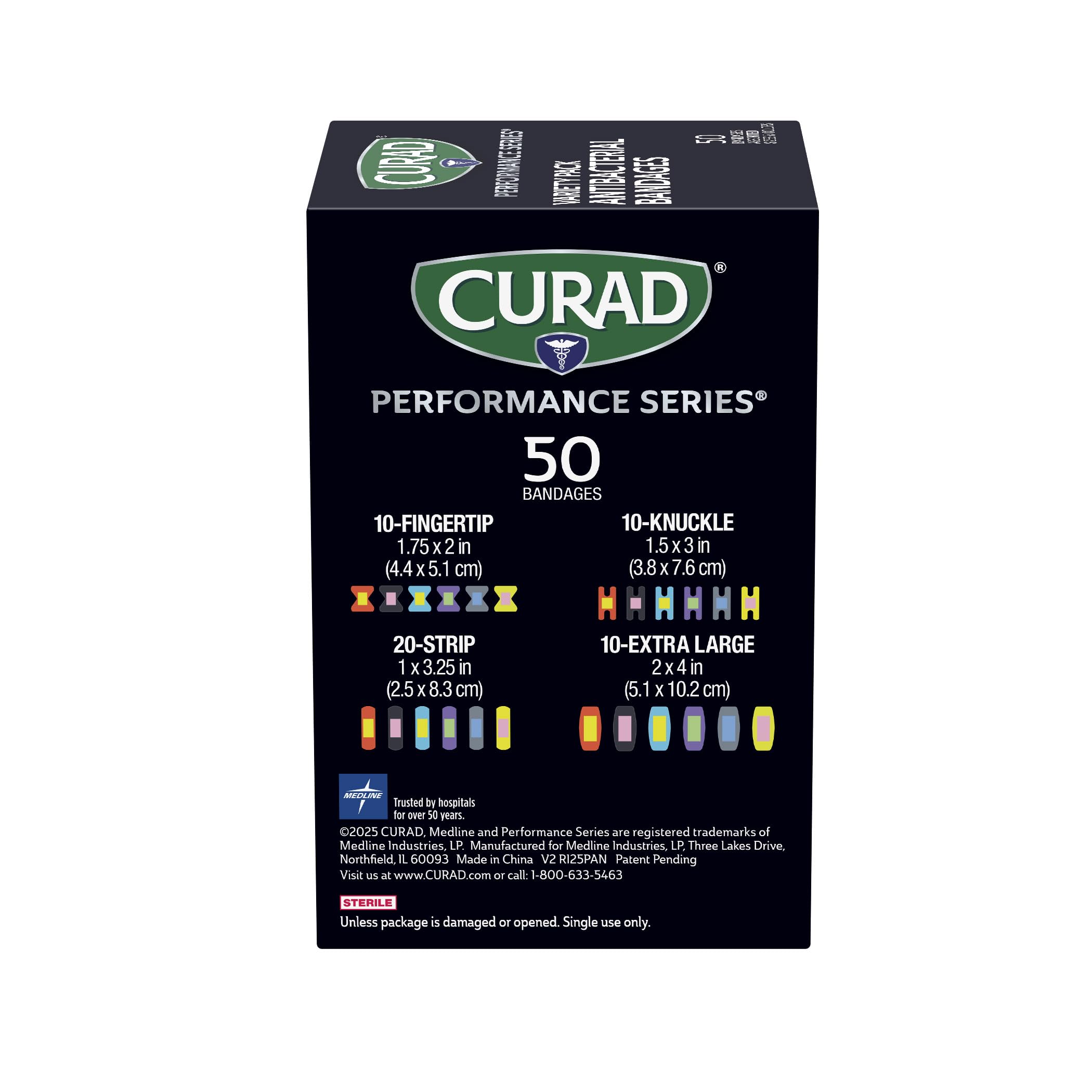 Product Description CURAD Performance Series presents IRONMAN Antibacterial Bandages, fortified with cutting-edge Extreme Hold adhesive technology for unwavering support. This assorted variety pack includes Standard, XL, Finger & Knuckle Fabric Bandages, totaling 50 in each pack. Engineered for endurance, these bandages are crafted with durable, heavy-duty fabric, offering outstanding protection suited for active individuals engaged in sports and rigorous activities. Featuring an antibacterial non-stick pad containing 0.8% Benzalkonium Chloride, these bandages help prevent infection while ensuring wound comfort without disruption. The rugged woven fabric is not only tough but also flexible, conforming to the body's movements for unparalleled comfort. Compared to other leading brands, the Performance Series bandages offer an impressive 3X more absorbency. Designed to endure the toughest workouts and competitions, these bandages stay put through rain, mud, and relentless movement. The CURAD Performance Series IRONMAN Antibacterial Bandages prioritize comfort, dirt protection, and germ resistance, ensuring unwavering support when faced with challenges. *Not for use on delicate and sensitive skin. Manufacturer Contact Information 800-633-5463