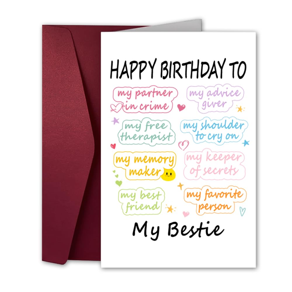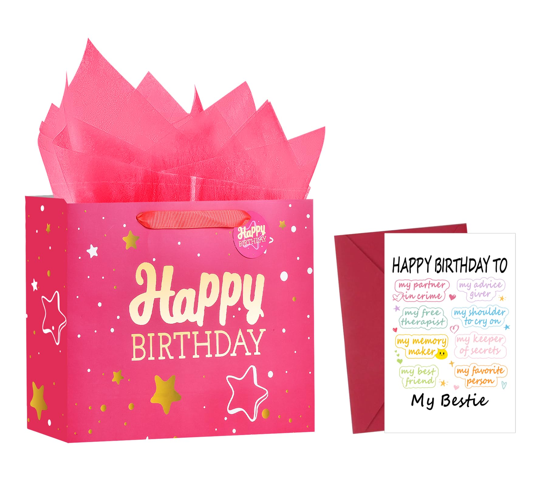 【Happy Birthday Gift Bag】Gift bag set includes a gift bag, a greeting card for bestie, and 2 sheets of tissue paper; the gift bag is 13 inches wide x 10.2 inches high x 4.7 inches long, and the greeting card is 7.9 inches wide x 5.9 inches high.