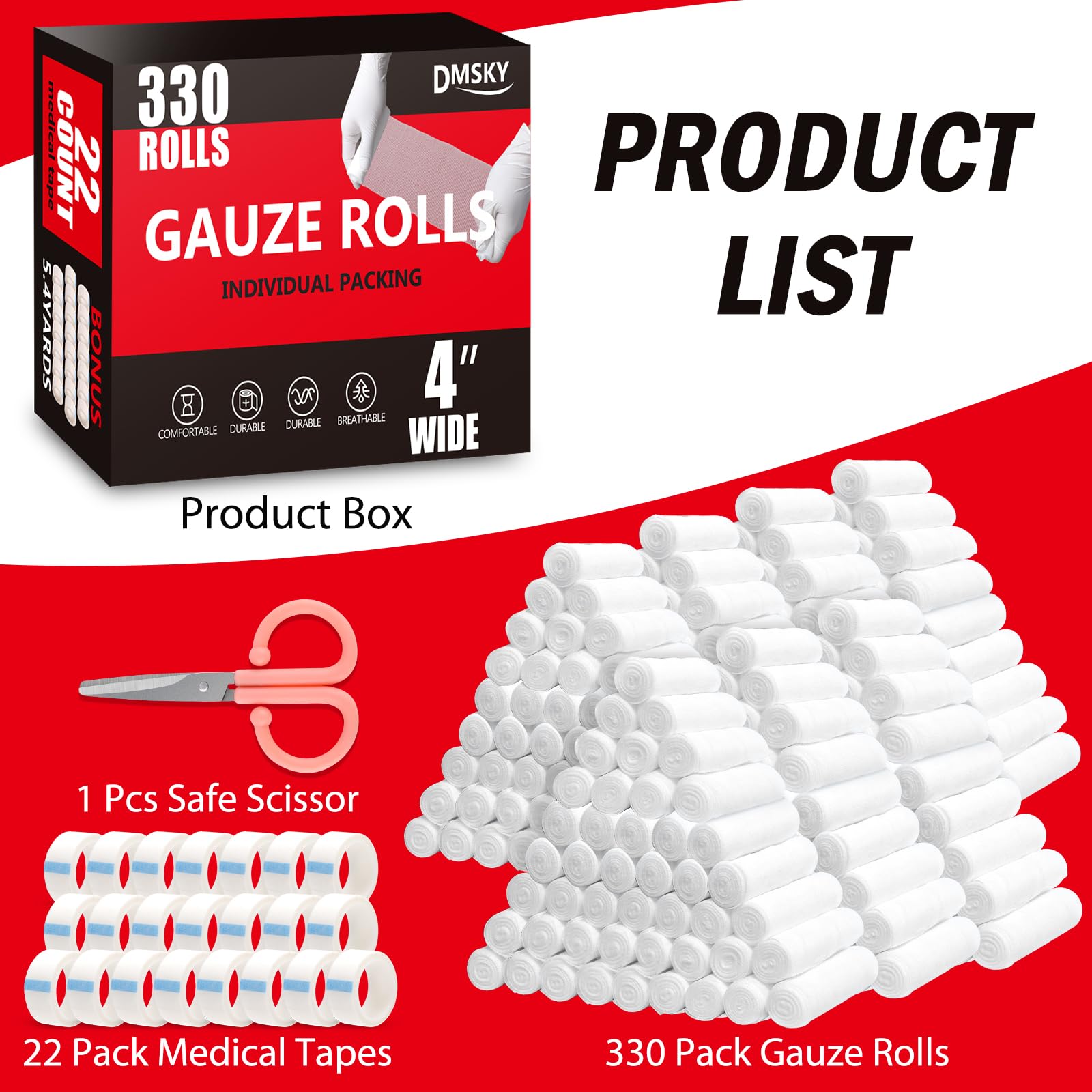 ✅【Individually Packed】330 pack individually wrapped gauze rolls with 22 medical tapes is the first choice for your first aid kit! Each roll is 4 inches x 4.1 yards, you can cut it according to your needs. This is a good supplement to your first aid kit, hospitals, schools and sports.