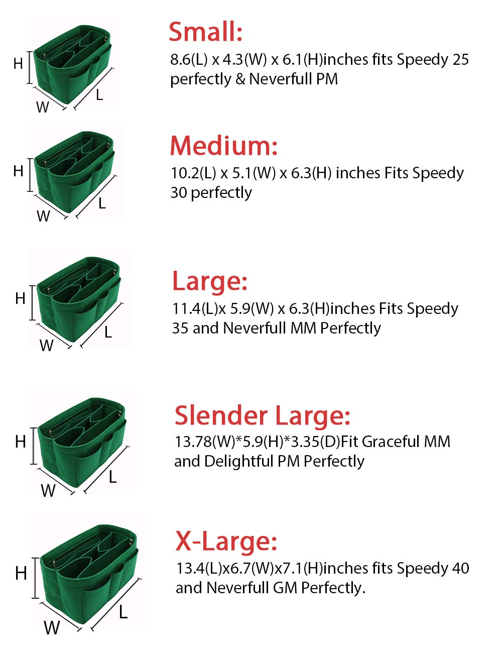 Small:8.6(L) x 4.3(W) x 6.1(H)inches fits LV Speedy 25 perfectly & LV Neverful PM ; Medium: 10.2(L) x 5.1(W) x 6.3(H) inches Fits Speedy 30 perfectly; Large: 11.4(L)x 5.9(W) x 6.3(H)inches Fits LV Speedy 35 and LV Neverful MM Perfectly.X-Large:13.4(L) x6.7(W)x7.1(H)inches fits LV Speedy 40 and LV Neverful GM Perfectly.Portable and Compact Purse Perfectly For any Brand, Such As LV, Longchamp Le Pliage Tote, MK, LV Petit Noe, Gucci, etc.