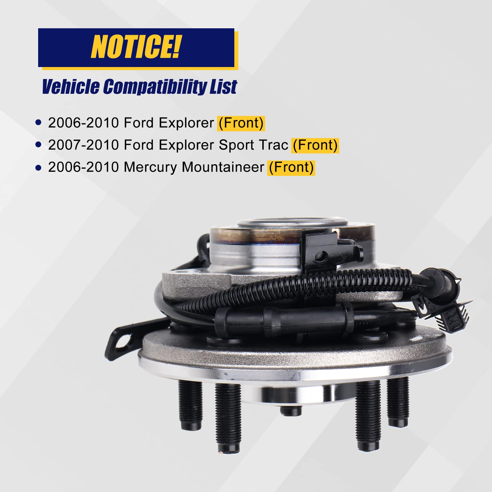 【Compatibility Vehicle】 515078 Wheel Bearing and Hub Assembly Replacement for 2006-2010 Ford Explorer(Front;5 Bolt ABS),2007-2010 Ford Explorer Sport Trac(Front;5 Bolt ABS),2006-2010 Mercury Mountaineer(Front;5 Bolt ABS)