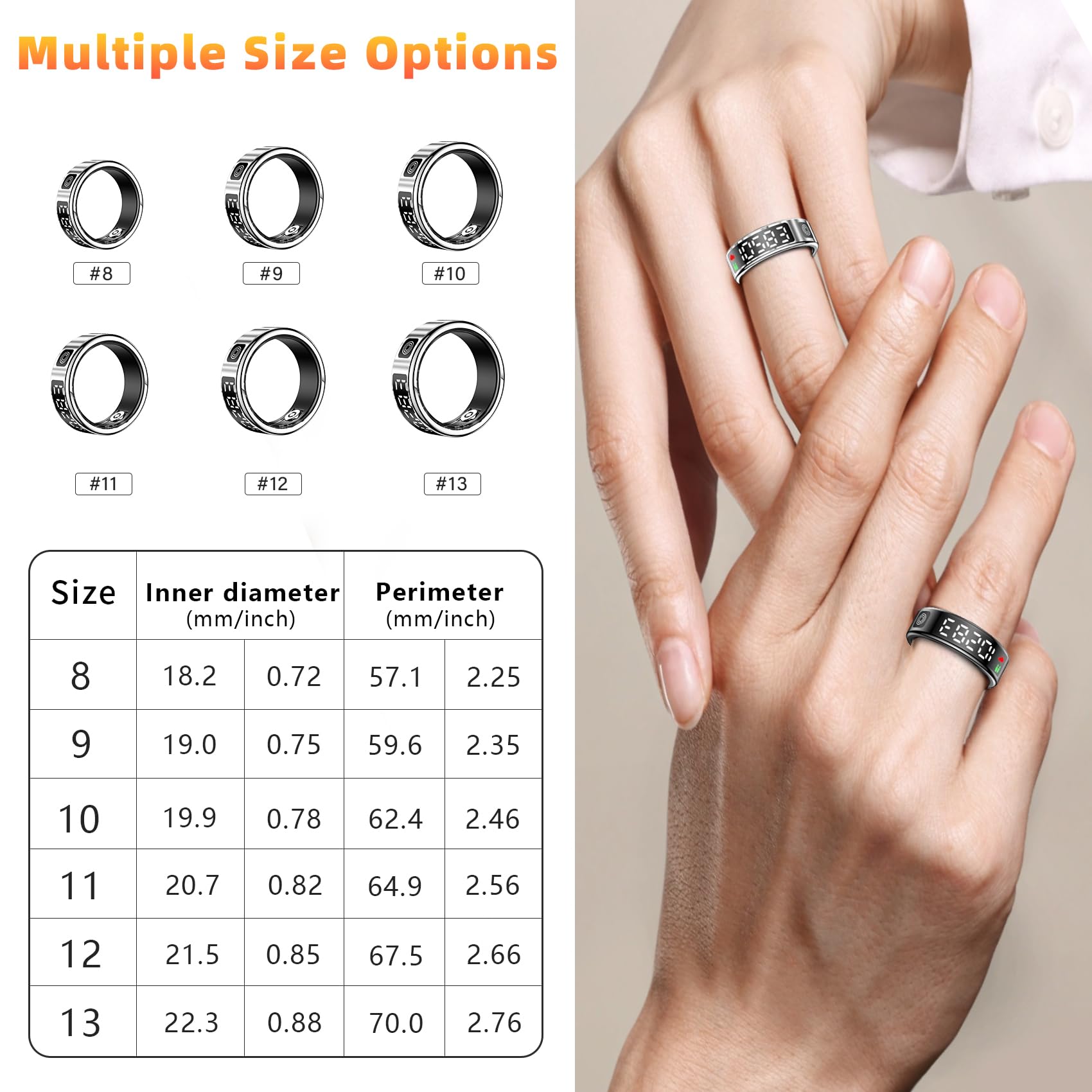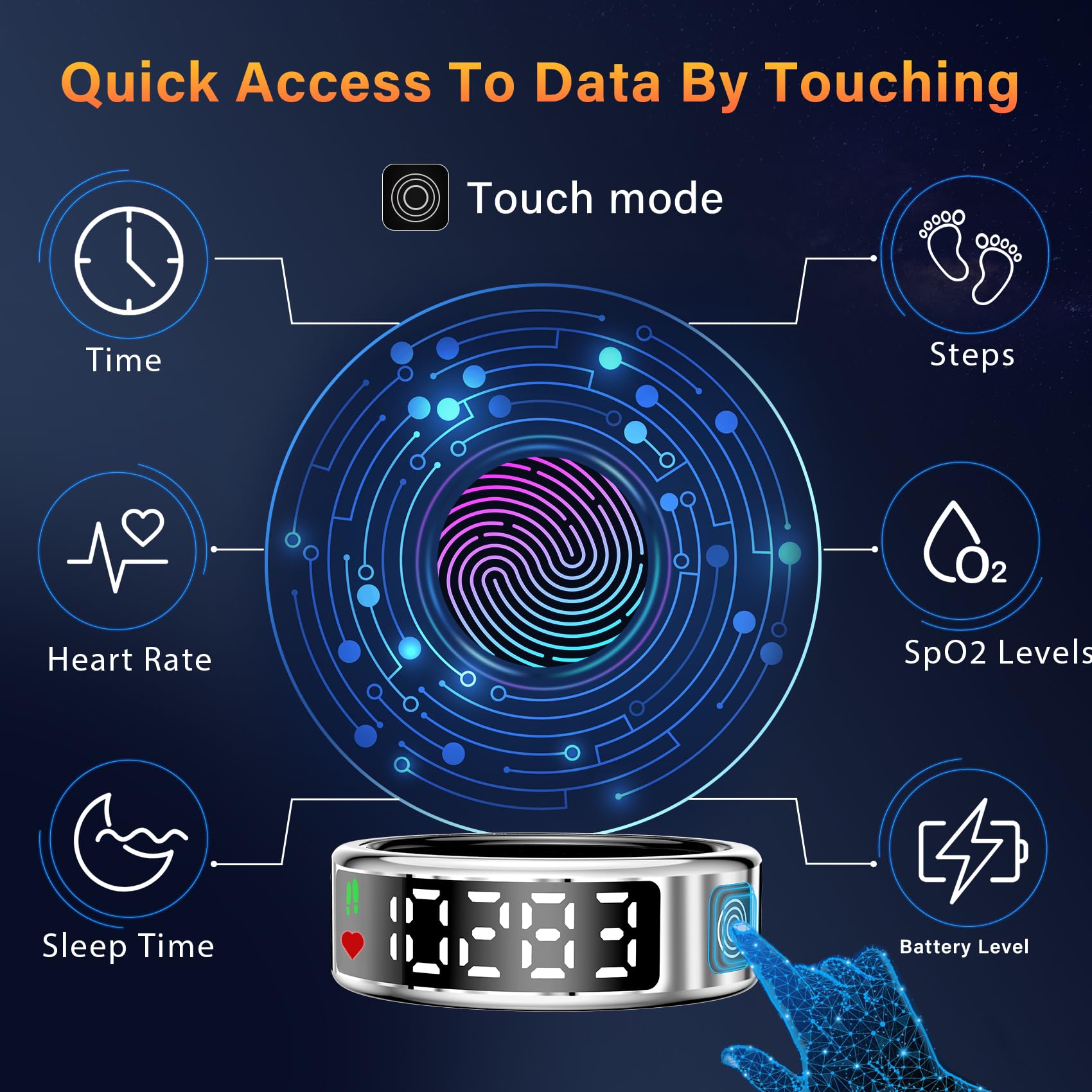 2025 New Version fitness ring with Touch Display & Multifunctional LED Display: Experience seamless device management with a high-definition LED screen and intuitive touch control. With a simple tap, you can effortlessly monitor essential data such as time, step count, heart rate, blood oxygen, sleep, and battery without needing to constantly take out your phone. Designed for ultimate convenience, our fitness tracker ring is perfect for work and fitness