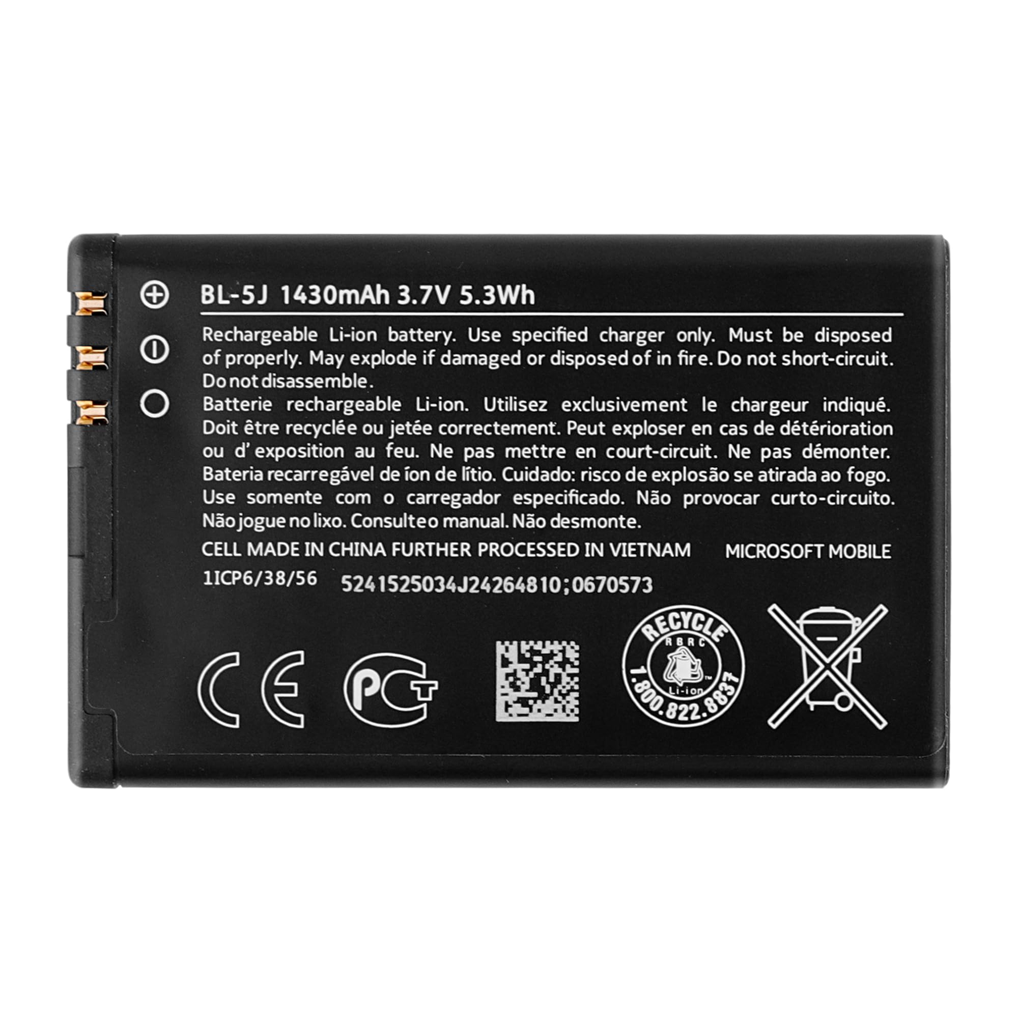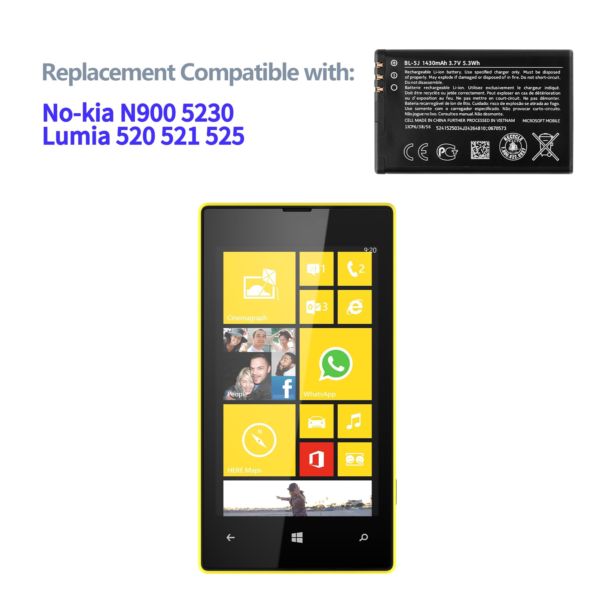 Products Part No:BL-5J Product Parameters:1430mAh Type:Polymer Packaging:1 x battery,1x tools Compatible model For Nokia N900 5230 Lumia 520 521 525 Important Notes 1.Please double check your device model before purchasing a battery to determine if this battery is compatible with your device. 2.If you don't know how to install it or it's your first time to install it, you can search for installation tutorials on "YouTube", there are a lot of cell phone battery installation tutorials on it.. 3.It is easy to replace old battery with brandnew battery. Please turn off your phone prior to replacement, carefully disconnect your old battery and then connect your new battery to the mainboard, please ensure battery is connected to cellphone well,easily install, no need to worry about the installation is too complicated. 4.It is recommended to fully drain and fully charge the battery especially during the first 3 charging and discharging cycles, doing so may greatly improve the overall life of the battery. Contact us If you have any questions about your order, please contact us and we will help within 24 hours. Hope you have a good day.