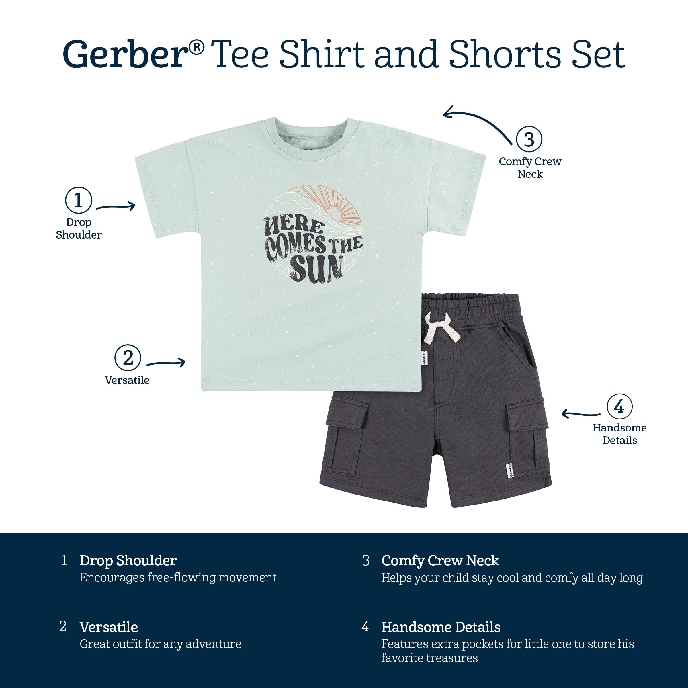 Description Get your toddler boy ready for sunny adventures with this T-shirt and shorts set. Crafted primarily from cotton with spandex for a comfortable stretch, it's the perfect outfit he'll want to keep on all day. Whether it's playdates or running errands, this toddler boy outfit combines the best of style and comfort for wherever the day takes you. With its soft, inviting texture and adorable pattern, he'll look cute and feel great. And with easy machine washing for stress-free care, it’s simple to keep this outfit ready all season long.