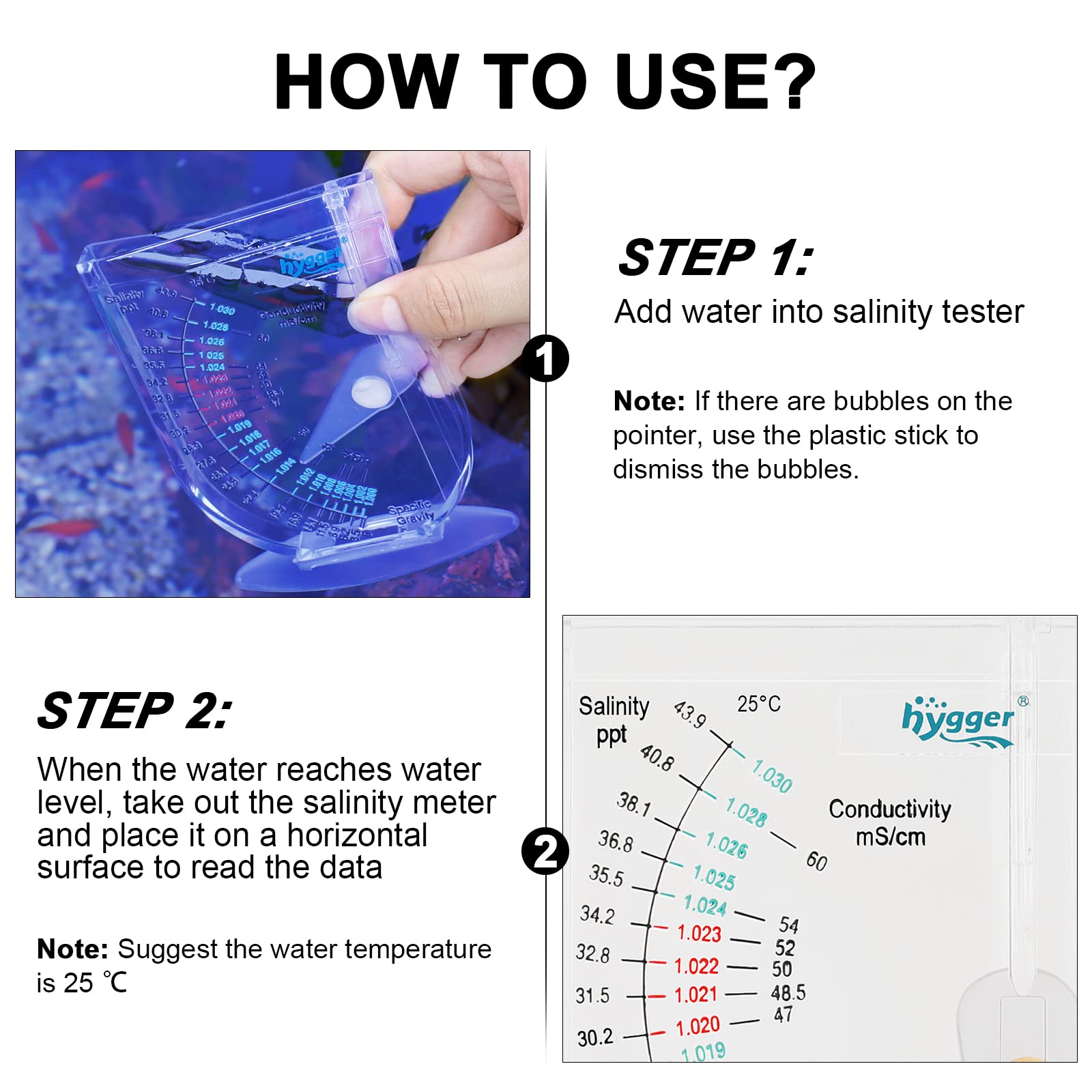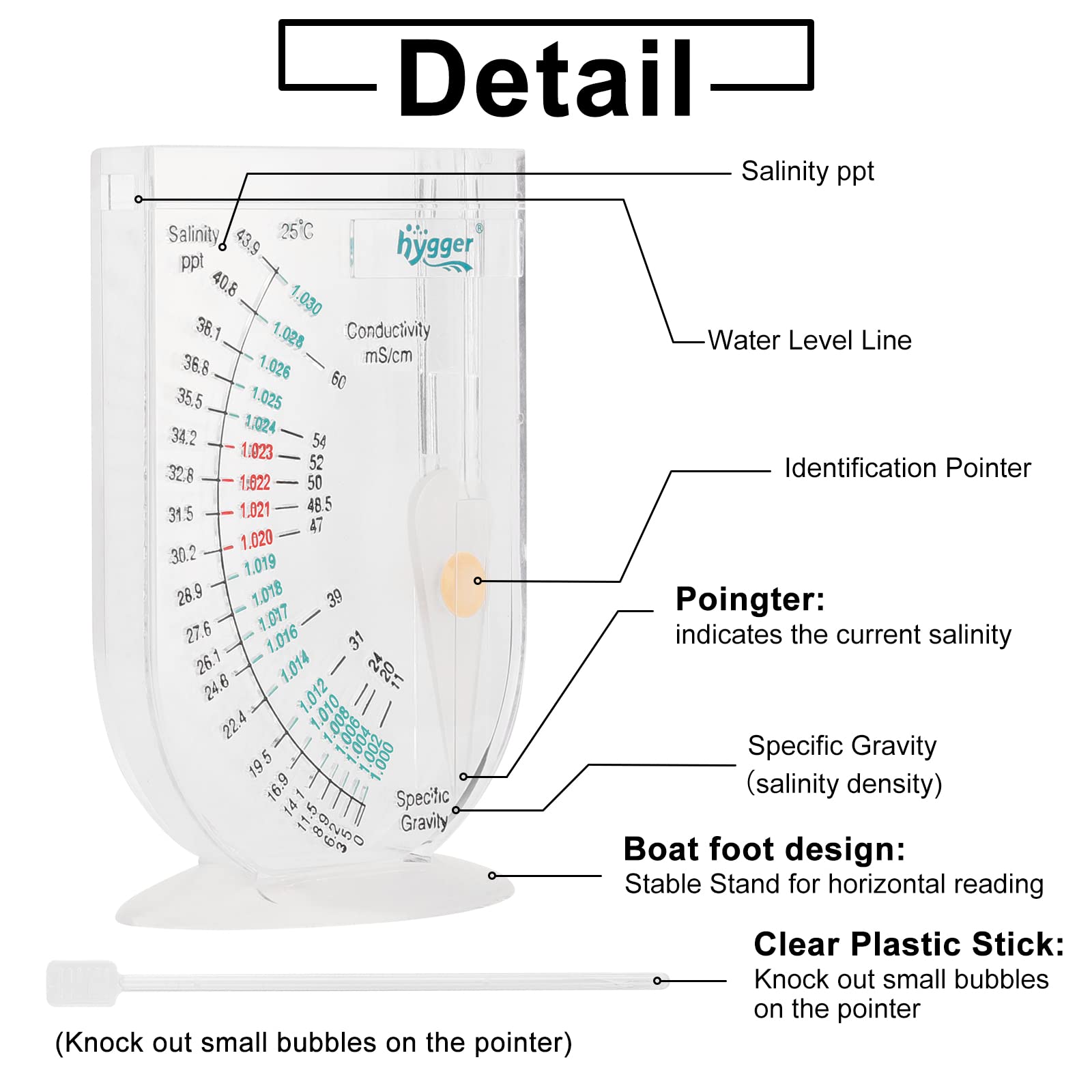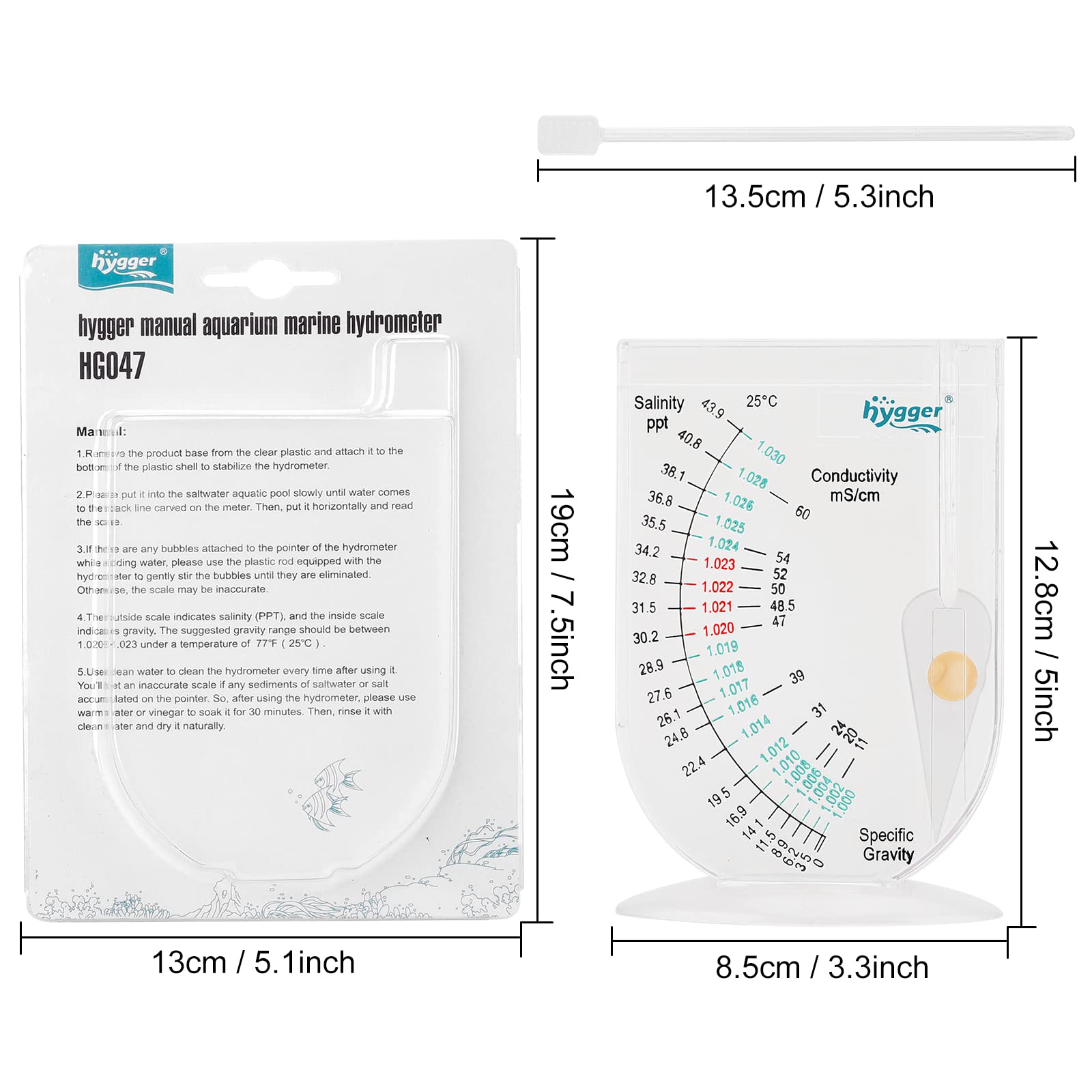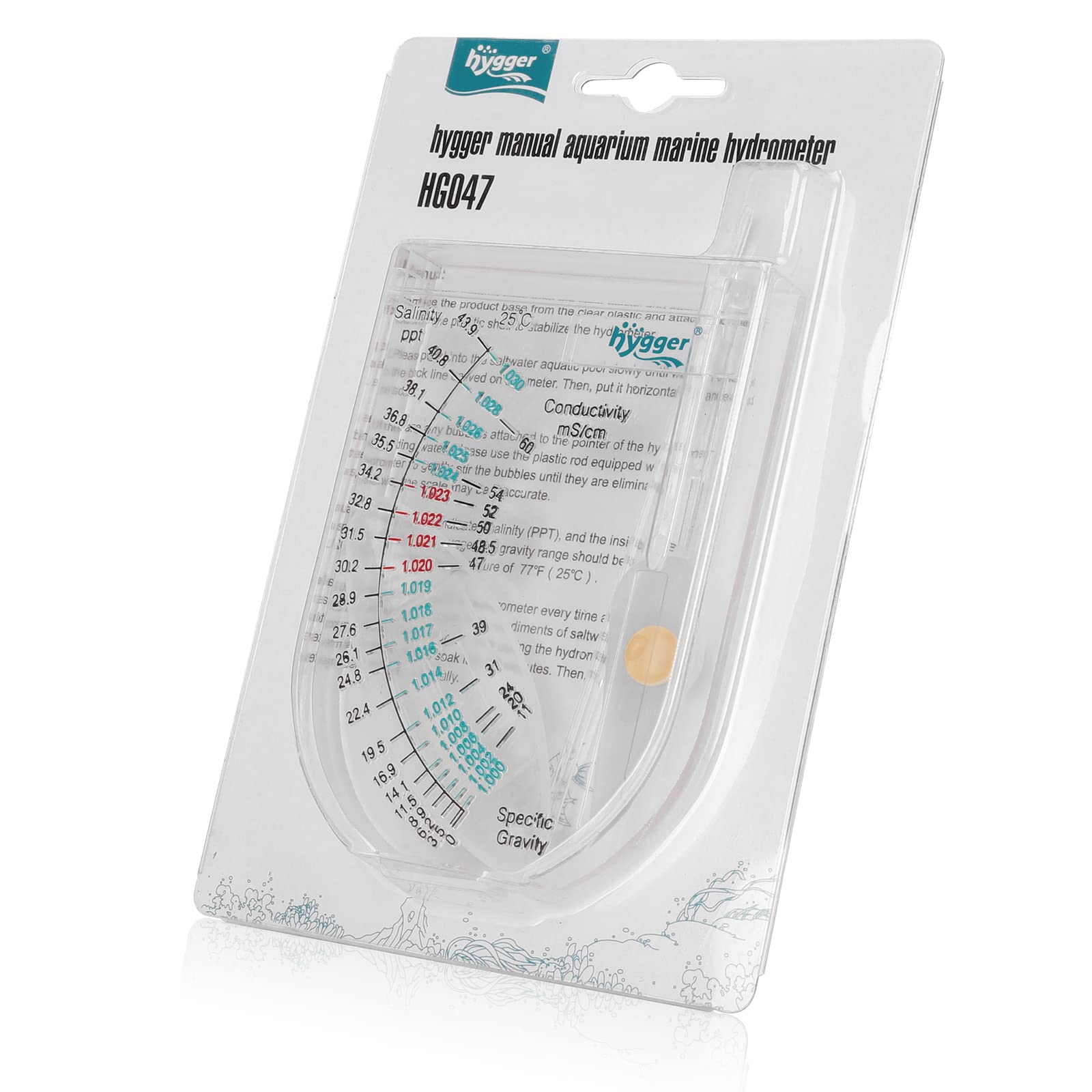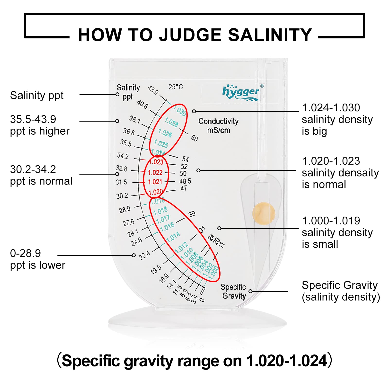 🐟Specification: The reading is temperature-corrected and accurate to +/-0.001. The unit of specific gravity is 1. 000-1. 030 (ppt value: 0-43.9 degrees), the safe area is 1.020-1.023 (ppt value: 30.2-34.2 degrees), and the low specific gravity area is 1.000-1.019 (ppt value: 0- 28.9 degrees), the higher specific gravity area is 1.024-1.030 (ppt value: 35.5-43.9 degrees).