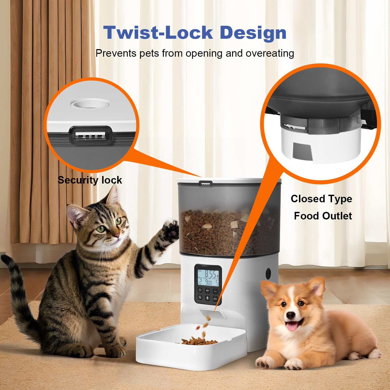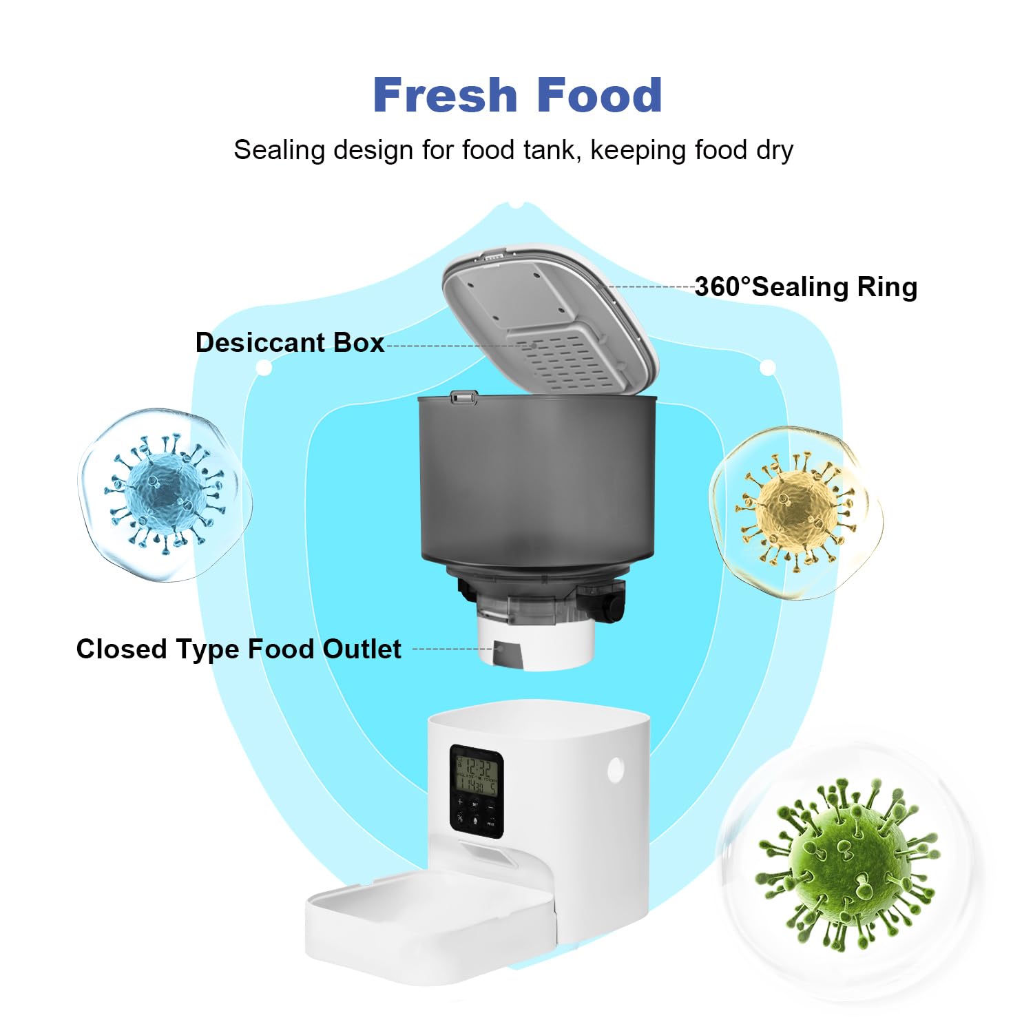 【Fresh food prioritizes health】-The automatic cat feeder features a finger broadcasting lid opening device at the top to prevent your pet from stealing food. We have designed a desiccant placement box in our food dispenser, the design can completely isolate the air to prevent food from getting damp and moldy. We have included a desiccant to ensure the freshness of pet food.