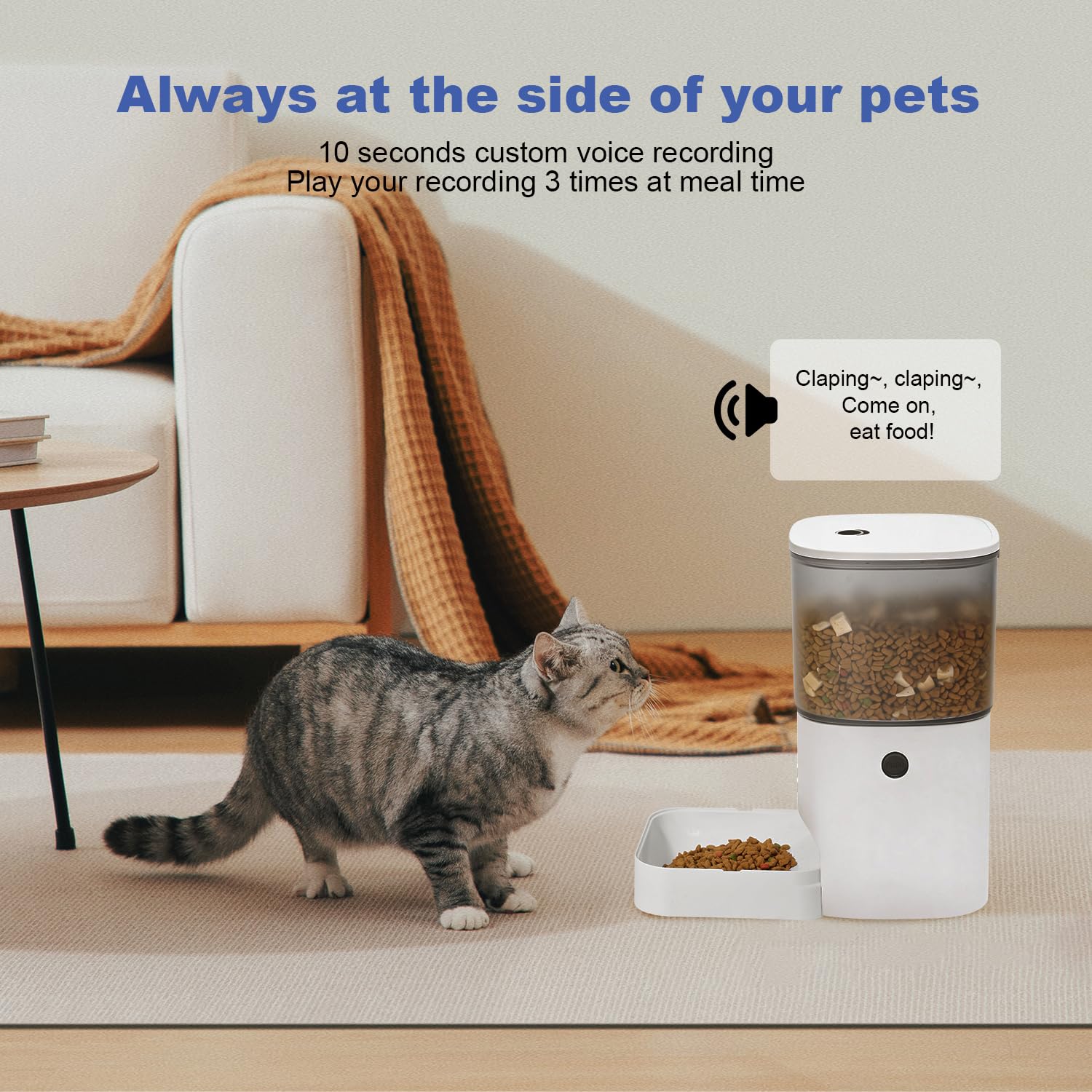 【Custom voice recording】-You can record 10s voice to keep connected with your pets. When the feeding time you set is up, the system will automatically play your recording 3 times to shout for your pet to come and eat. Your voice will keep a close relationship with your pet and also let your pet eat with peace of mind.