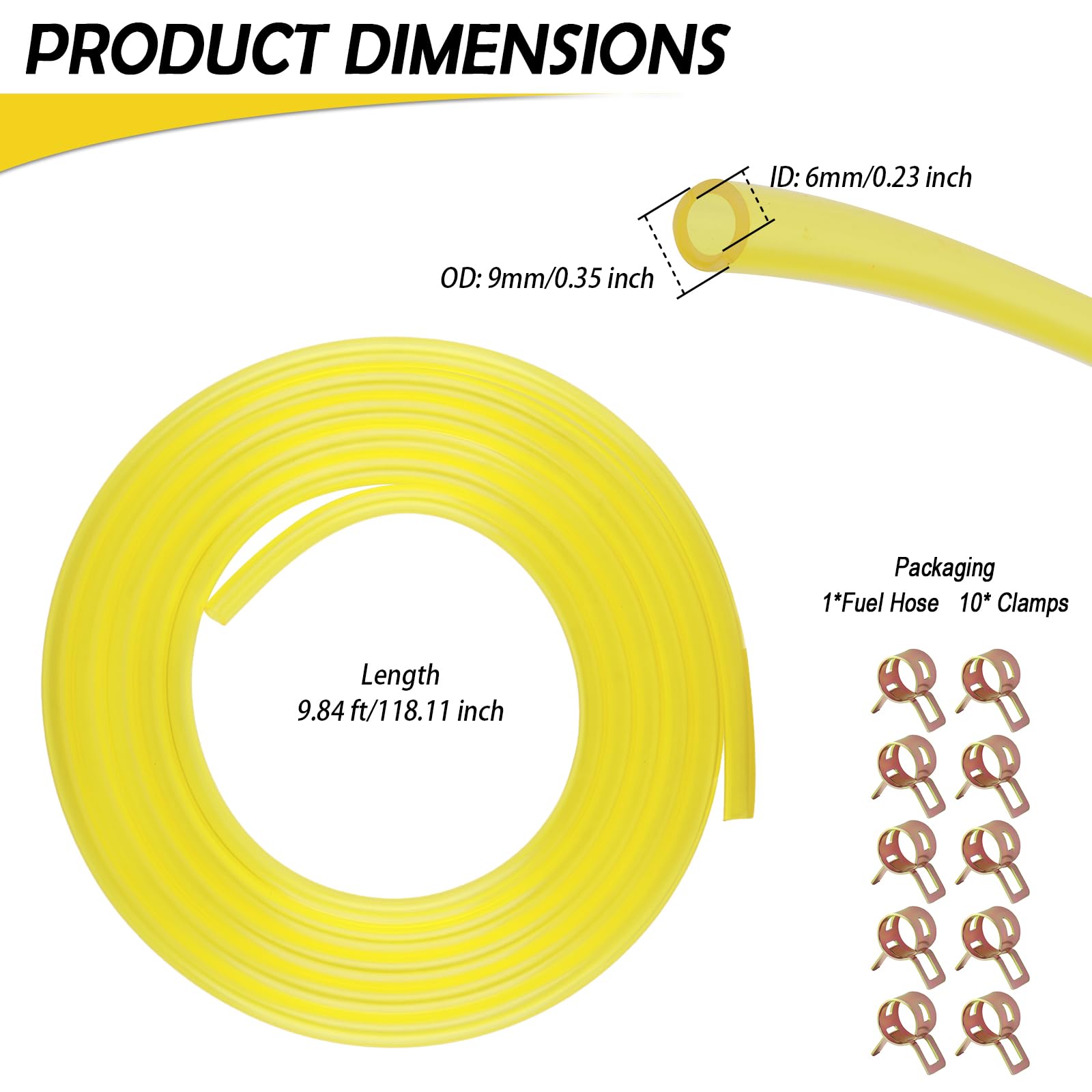 FUEL HOSES - SAFE AND EFFICIENT FOR WORRY-FREE FLOW Product Attributes Colors: Yellow Sizes: ID: 6mm/0.23 inch OD: 9mm/0.35 inch Length: 9.84ft/118.11 inch Weight: 6.45 oz Material: PVC Packaging: 1*Fuel Hose+10* Clamps Product Feature & Functions 1. The toughness of PVC material makes the hose have good anti-abrasion performance, and it is not easy to be broken by slight friction with the equipment parts in daily use 2. Translucent tube wall design avoids overflow or insufficient supply caused by blind operation, so that every delivery is clear and safe 3. Reliable sealing, when connecting the interface, just fix the clip on the connection, it can form a tight seal, effectively blocking the leakage of the medium