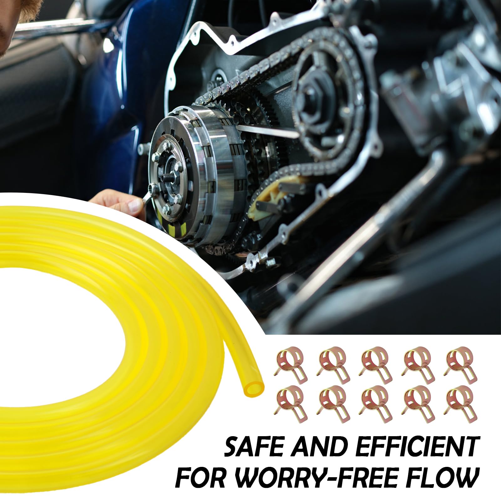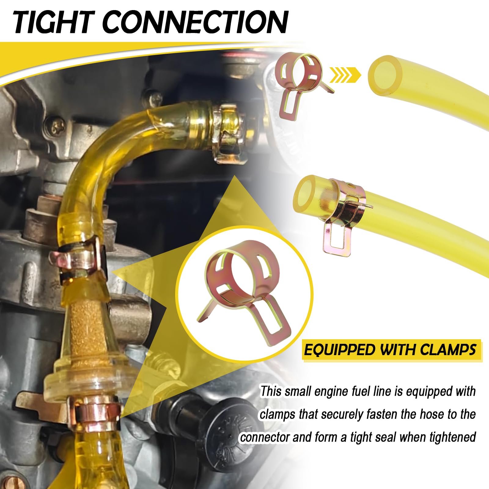 TIGHT CONNECTION: This small engine fuel line is equipped with clamps that securely fasten the hose to the connector and form a tight seal when tightened, effectively avoiding leakage during delivery. To install, simply slip the hose into the connector and secure it with the clamp