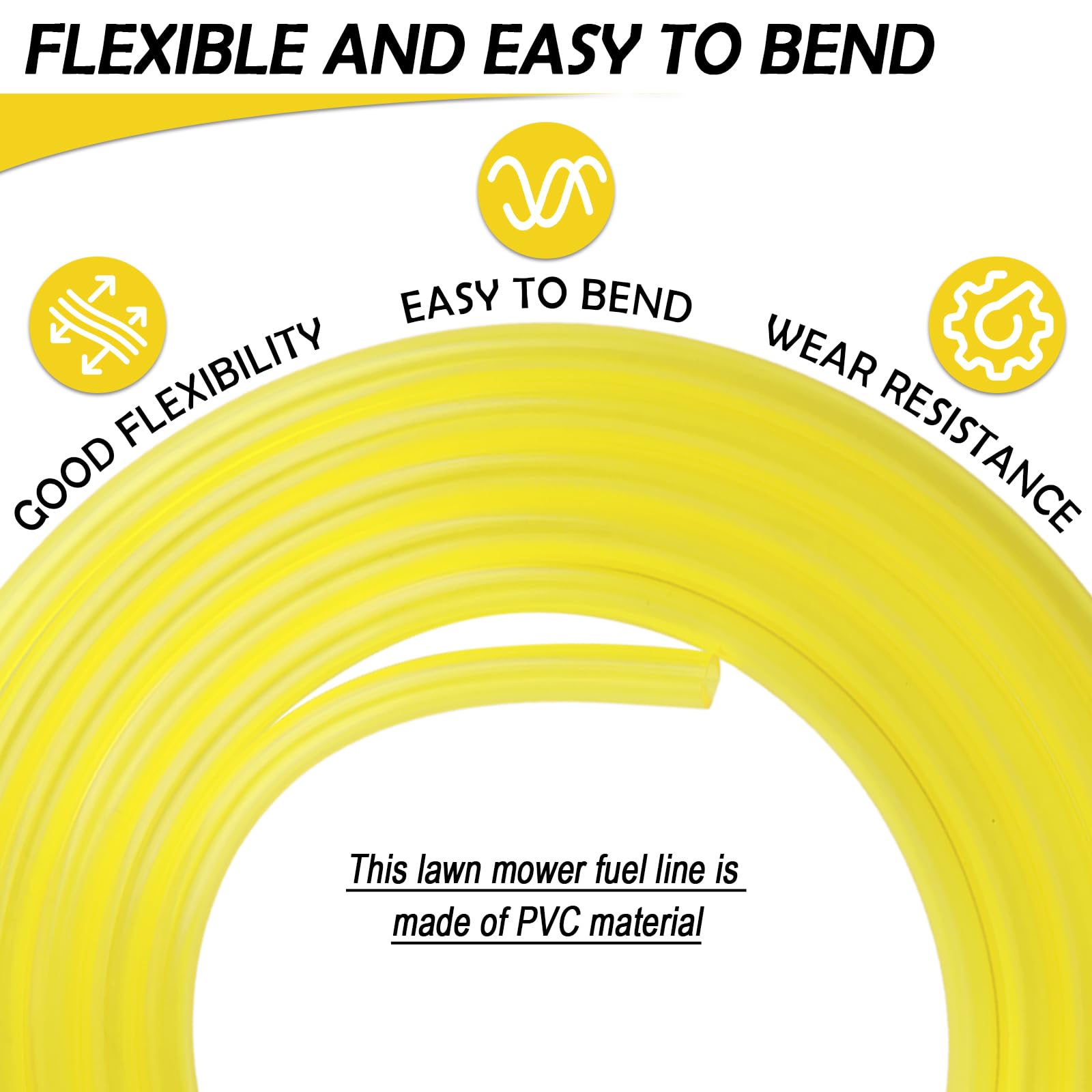 FLEXIBLE AND EASY TO BEND: This lawn mower fuel line is made of PVC material, which is flexible and can be easily bent into various angles to fit different equipment installation spaces. Whether you need to bypass equipment components or lay in a narrow space, it can fit flexibly