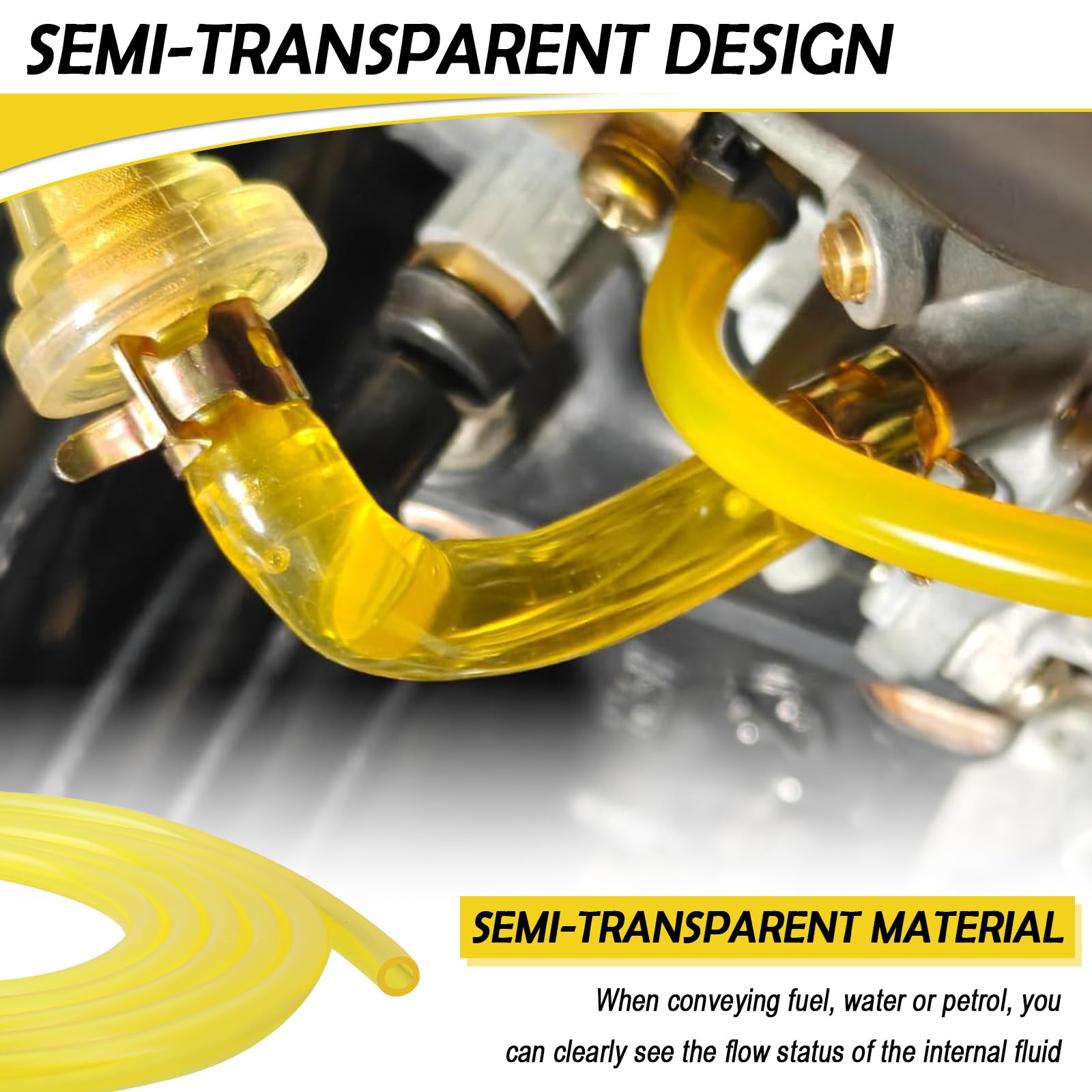 SEMI-TRANSPARENT DESIGN: Gas line hose is made of semi-transparent material, when conveying fuel, water or petrol, you can clearly see the flow status of the internal fluid. You can always observe whether there are air bubbles, impurities, or judge whether the delivery is complete