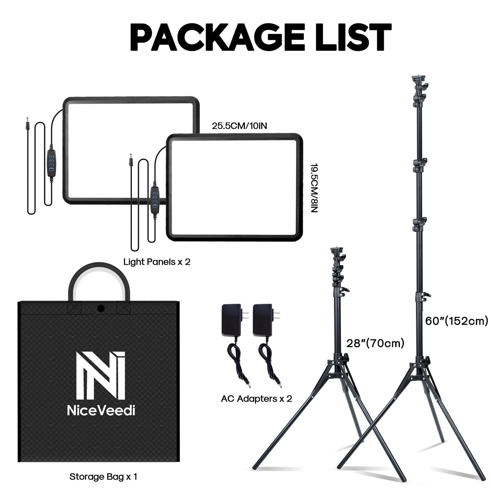 【Package List & Customer Service】There will be 2 LED studio light panels with cable, adjustable tripod stand for each light panel, 1 user manual, 1 storage bag, 2 AC adapters. Whatever issues you meet during the usage or any defects arise, rest assured that we are here to assist you.