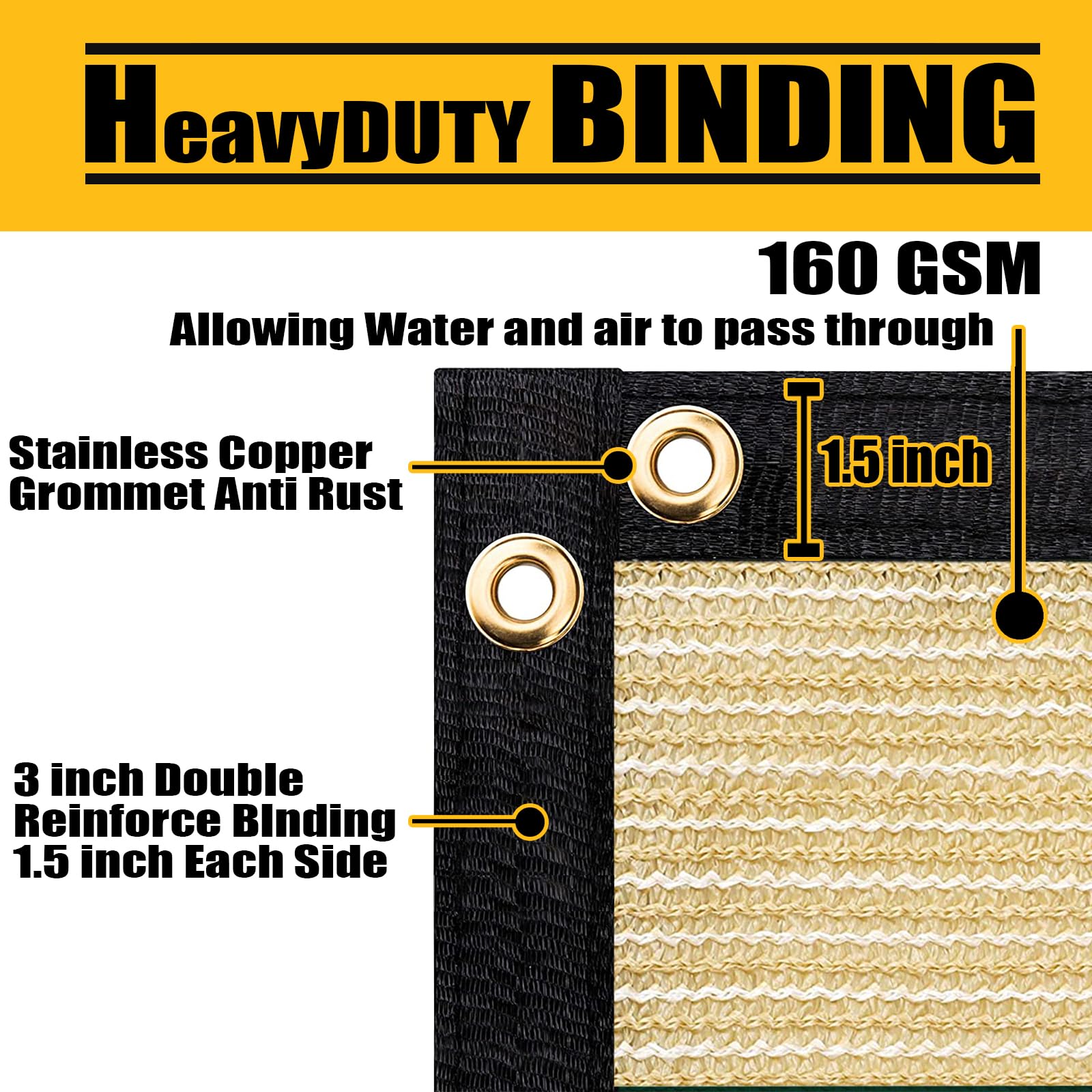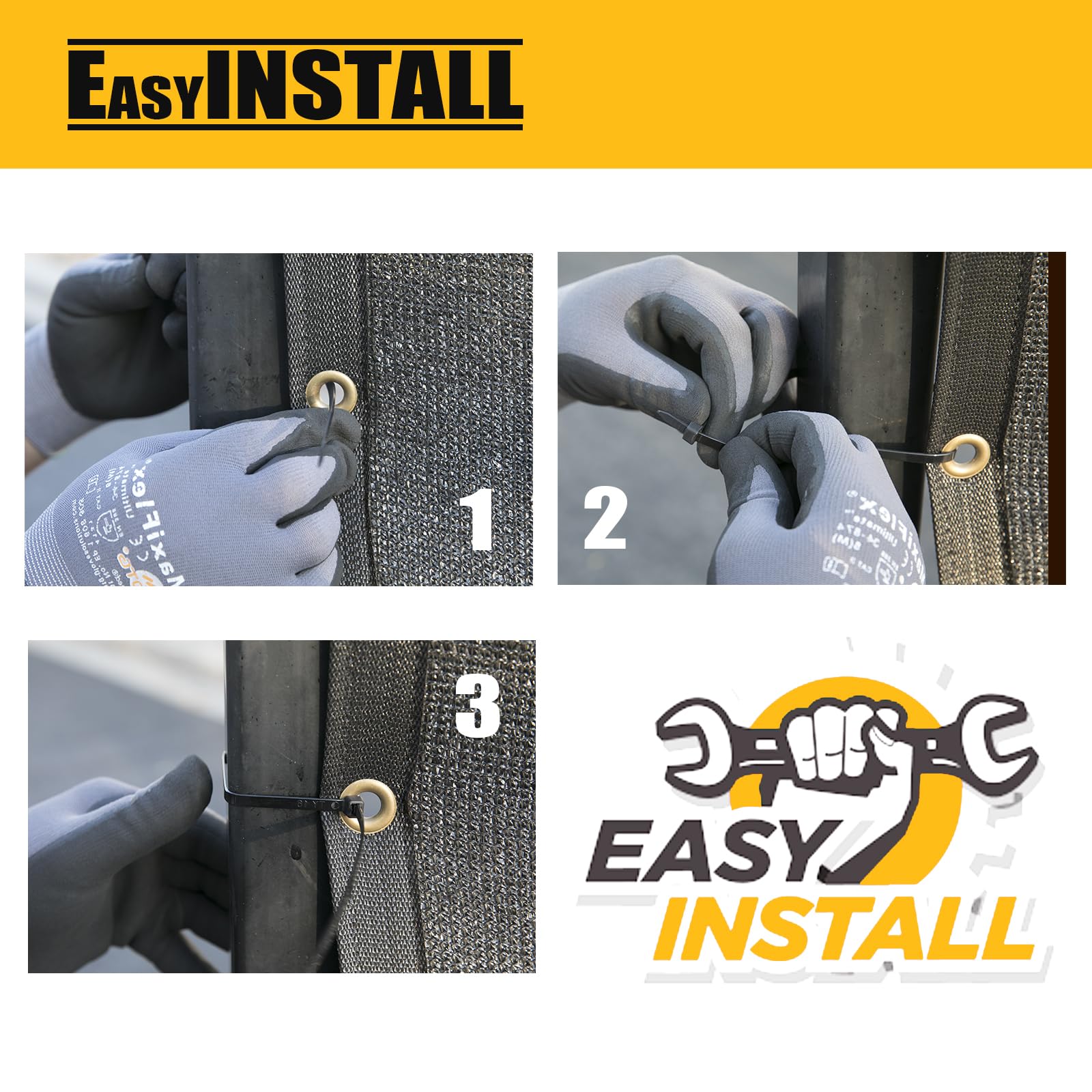 This product is easy to install. Use included zip ties to fasten the grommets to the fence on each side. There are double stitch black binding and grommets on each side.
