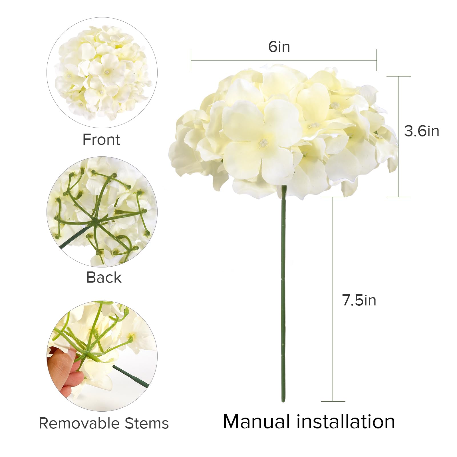 Flower Size: Hydrangea head diameter is about 6 inches, height is about 3.6 inches; Independent stem length is about 8 inches. The suitable size can meet your different using purposes and suit match any decor style or occasion and you can easily arrange them in vases, bouquets, or floral arrangements