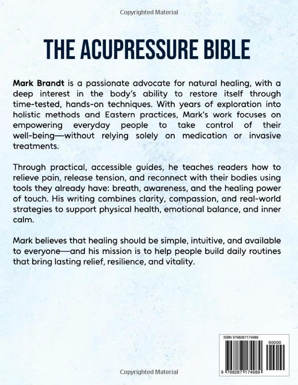 Are you tired of chronic pain, anxiety, or fatigue disrupting your daily life? Do you wish you could heal your body naturally—without relying on pills or costly treatments? Let’s face it—modern life is overwhelming. We sit too long, stress too much, and sleep too little. The result? Persistent discomfort, emotional imbalance, and low energy that no quick fix can solve. But what if the key to lasting relief has been in your hands all along? In The Acupressure Bible, you’ll discover how to tap into your body’s innate healing power using nothing but your fingertips. Whether you're struggling with migraines, insomnia, digestive issues, or burnout, this book gives you clear, targeted techniques to restore balance—naturally and effectively. In this book, you will find: ✅ Instant Relief at Your Fingertips: Unlock over 100 powerful pressure points to soothe pain, calm the mind, and energize your body in minutes. ✅ No Experience Required: Follow step-by-step instructions with visual guidance—designed for total beginners yet powerful enough for advanced users. ✅ From Headaches to Hormonal Imbalances: Target a wide range of physical and emotional symptoms with specialized acupressure routines. ✅ The Wisdom of Chinese Medicine, Simplified: Learn the core principles of meridians, Qi, and healing energy in an easy-to-understand way. ✅ Digital Visual Atlas Included: Scan a QR code to access a high-resolution image bank of all pressure points—perfect for mobile or tablet use. ✅ Designed for Daily Life: Quick routines for your morning energy boost, stress relief at work, and deep relaxation before bed. And much more! Imagine finally having a gentle, drug-free solution that helps you feel grounded, pain-free, and in control of your body again. Whether you're seeking better sleep, emotional stability, or simply more energy to enjoy life, The Acupressure Bible will guide you toward true balance and healing—one point at a time. Ready to feel better naturally? Scroll up and get your copy today!