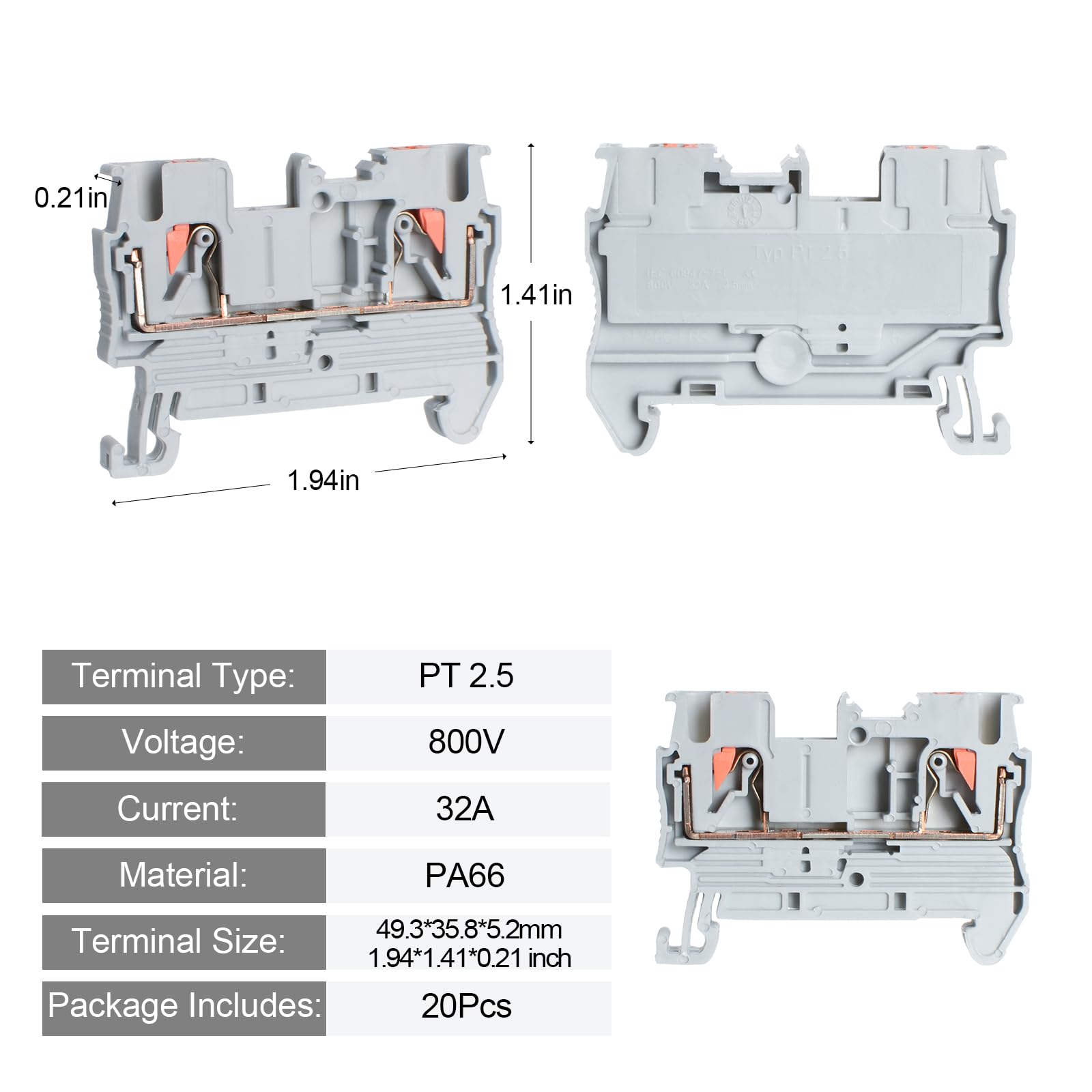 【Product Parameters】: Brand: GUETNEU Colour: Gray, orange, blue Housing Material: High quality PA66 materials Conductive Sheet: Pure copper Terminal type: PT 2.5 Current: 32A Voltage: 800V Wire range: Flexible wire: 0.2-0.5 Hard wire: 0.2-4