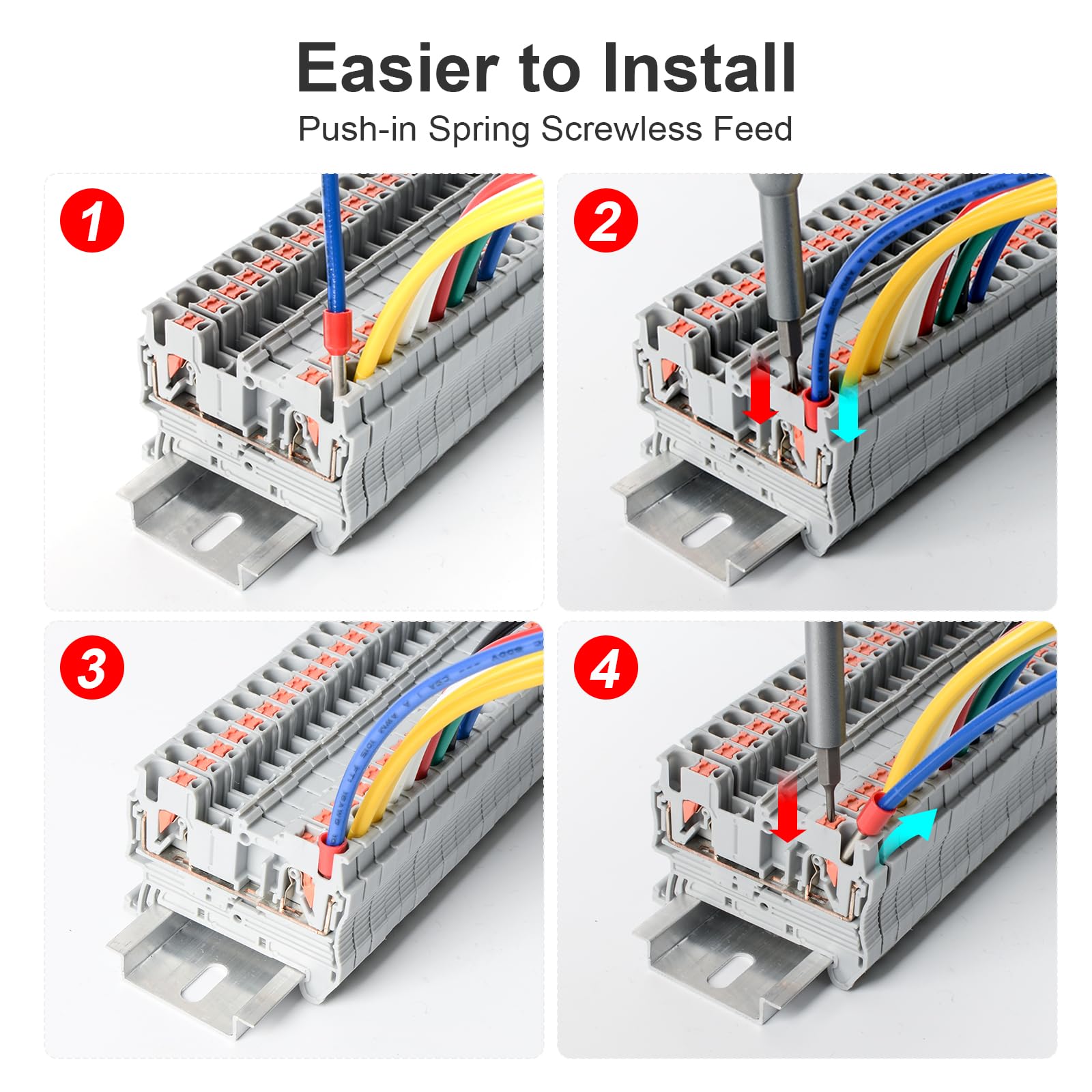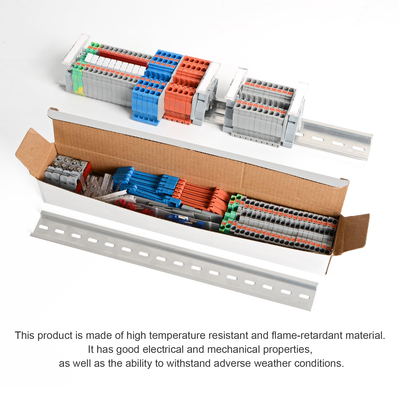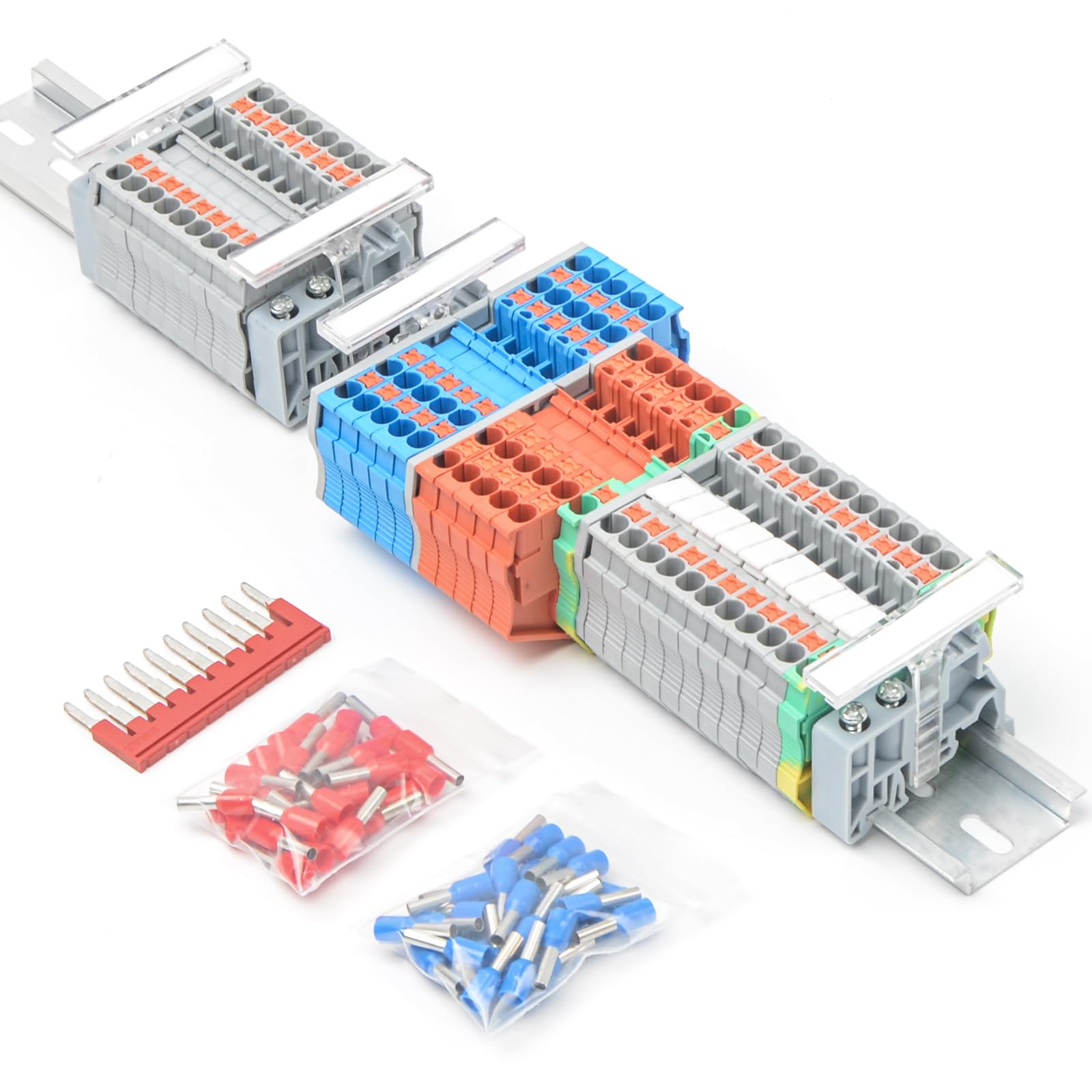 【Product Suite Group】: Including 1 32cm guide rail, 1 side plug-in, 2 marker strips, 2 grounding terminals, 4 baffles, 4 marking clips, 4 universal fasteners for guide rails,20 gray terminal blocks, 5 orange terminal blocks, 5 blue terminal blocks, and 32 needle tube terminal lugs in red and blue, a total of 64 pieces.
