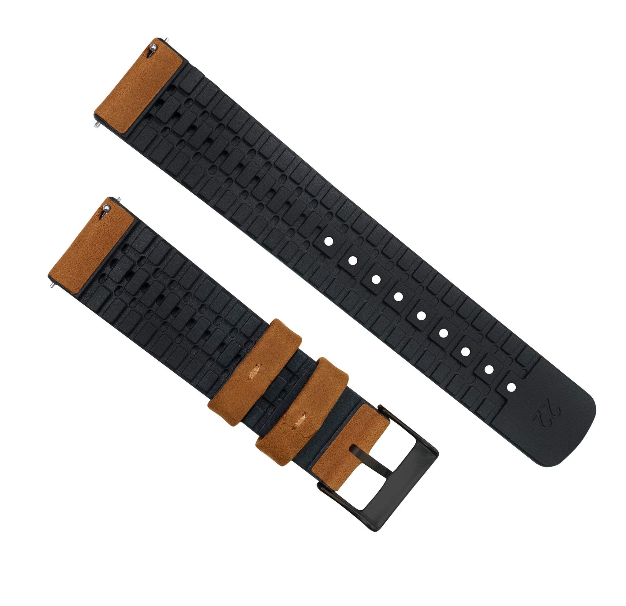 Description Material: Top-grain leather & 80D rubber Hardware: 316L stainless steel or Black PVD This Black Leather and Rubber Hybrid Watch Band combines the best of both worlds, offering comfort, style, and flexibility. Featuring a treaded 80D rubber base, 316L stainless steel or black PVD hardware, and top-grain leather, this Watch Band is ready for anything your day might throw your way. Our top-grain leather has been waxed, polished, and softened. This unique treatment allows the natural characteristics of the leather to shine through. Be aware that a natural patina will develop over time, giving this watch band a worn-in, timeless, and rustic feel. These simple imperfections add a rich texture to your timepiece! The quick-release spring bar mechanism allows for easy replacement without any tools. Standard length fits wrists 5" to 8" For: 18mm, 20mm, and 22mm timepieces Swap in Seconds: Integrated quick release spring bars Sizing: Standard length fits wrists 5" to 8" Band Width: 22mm (20mm at buckle), 20mm (18mm at buckle) & 18mm (16mm at buckle)