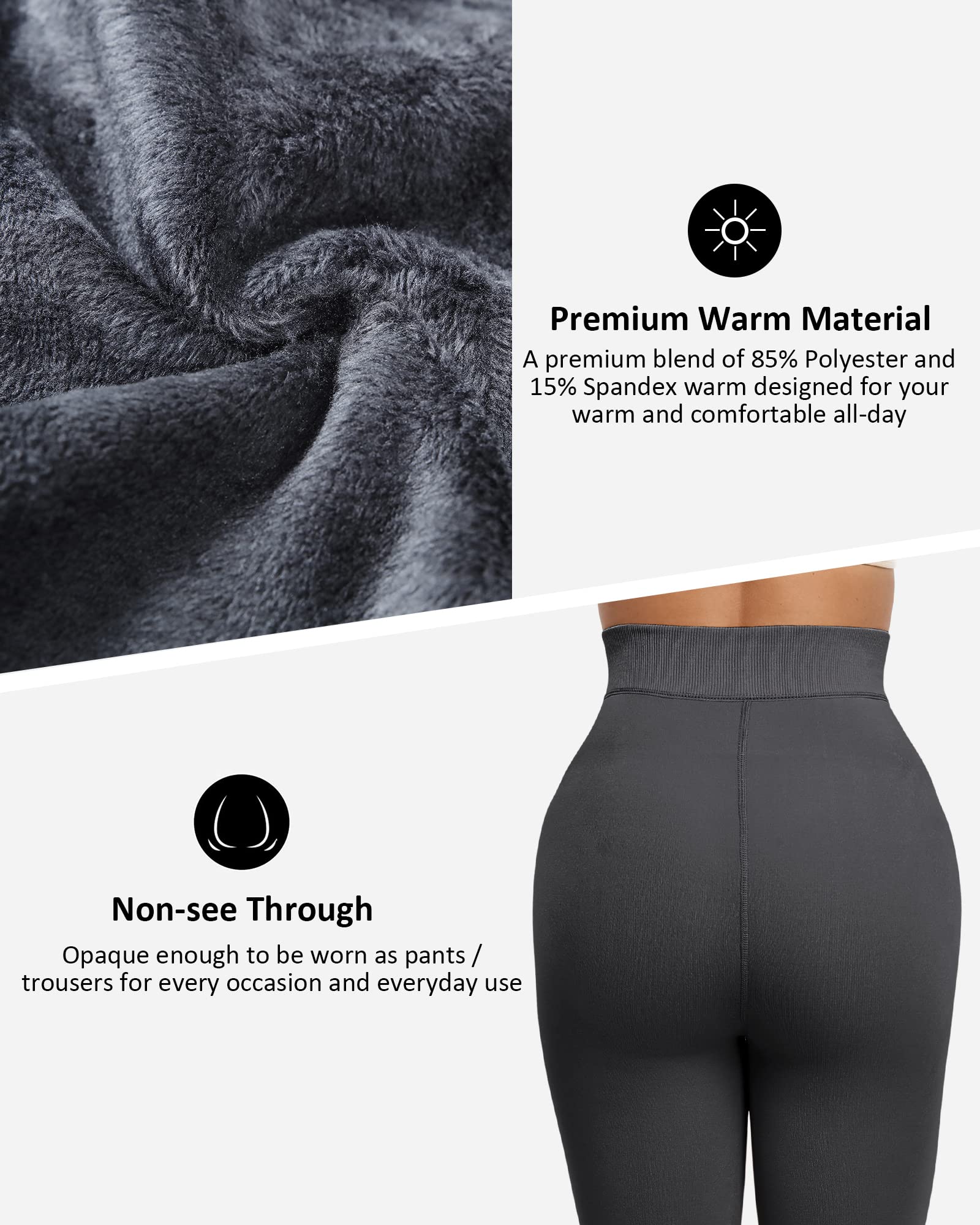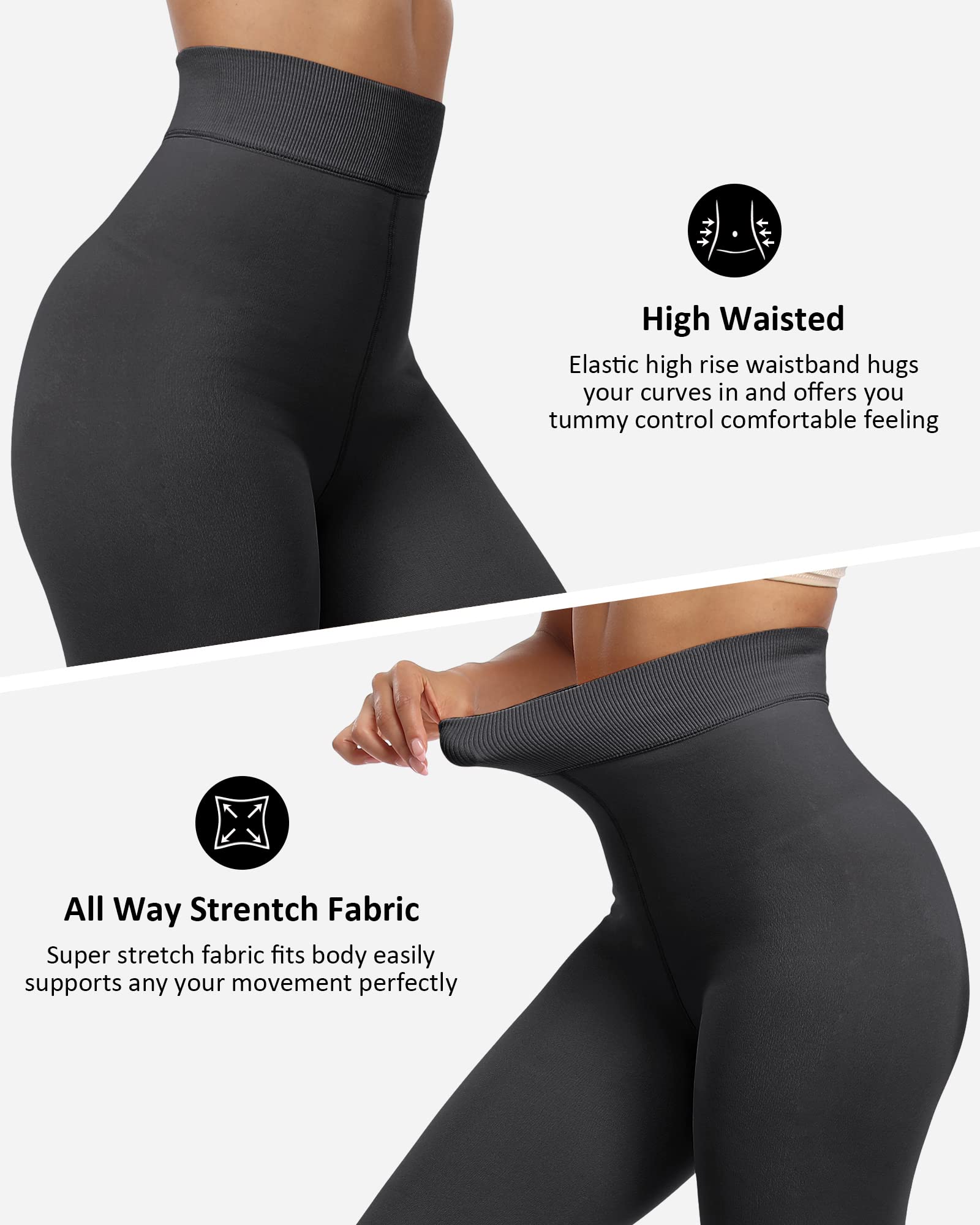 ☀Updated Suture & Soft Warm Material : The fleece lined leggings for women are updated two ugly butt suture into one normal suture, which more beautiful and comforty; and the velvet leggings are updated with 85% polyester + 15% spandex, which are very soft, sleek, elastic and comfortable, these fleece leggings are a must-have for your cold gear collection.