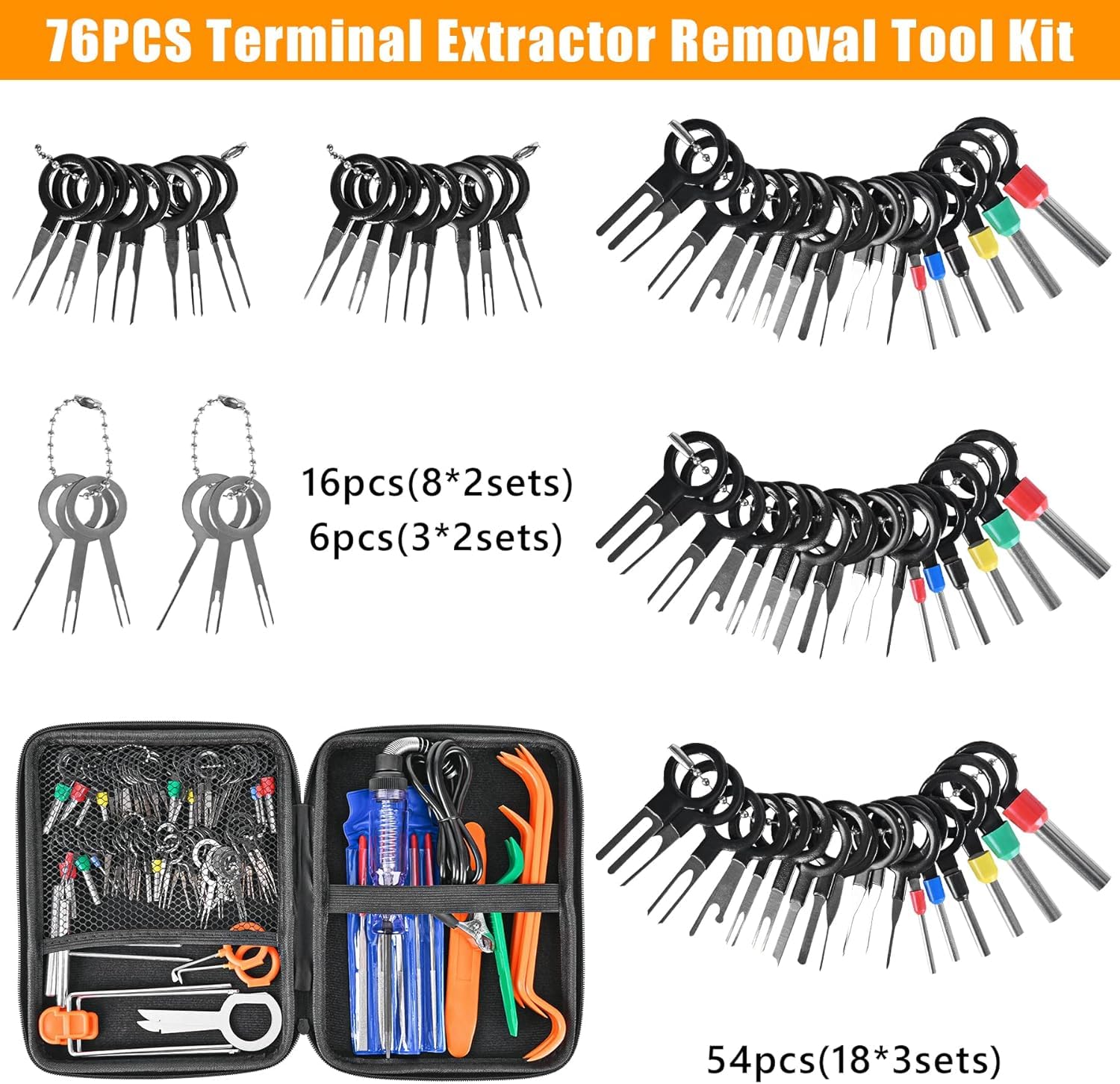 【Package Include】96PCS Terminal Extractor Removal Tool Kit includes 76pcs Terminal removal tool Kit, 1pcs Automotive Circuit Tester, 5pcs Diamond Grip Terminal Cleaner Set, 13pcs Automotive Trim Removal Tool Kit and 1pcs protective bag