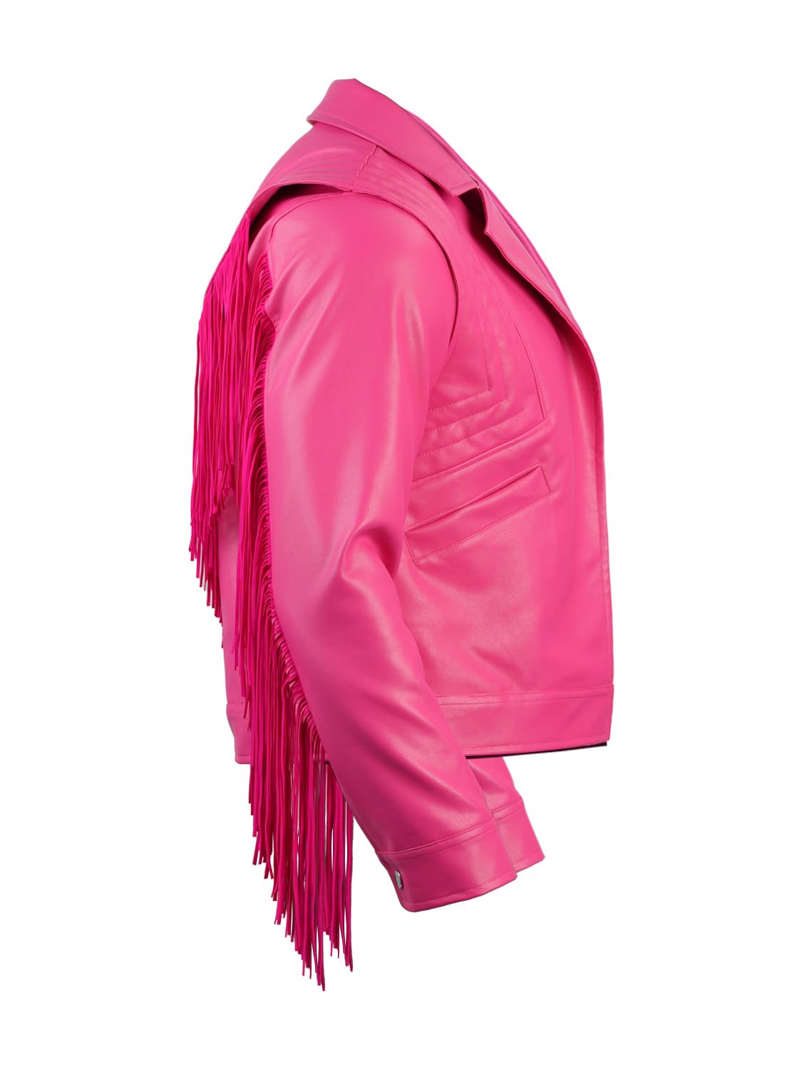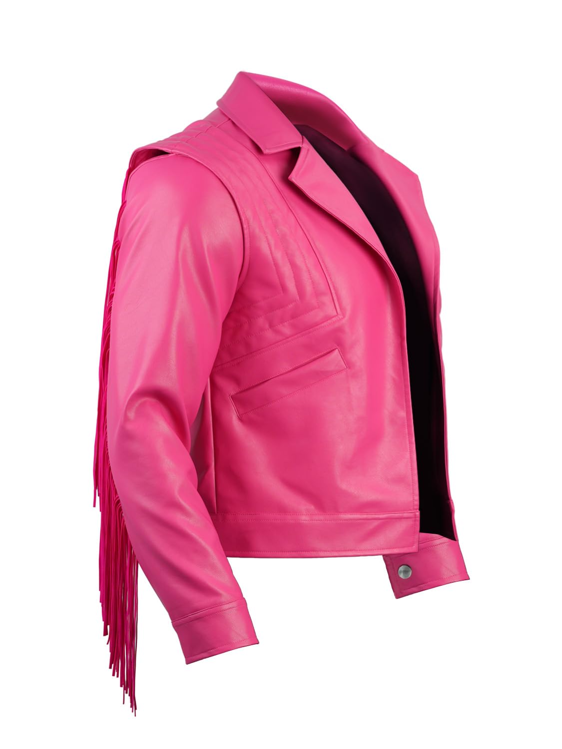 Edgy Punk Inspired Design-This jacket boasts a bold pink hue complemented by intricate tribal patterns and metal rivet detailing, capturing the essence of punk and gothic fashion.