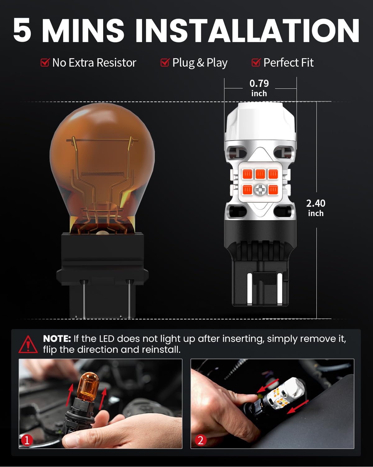 【5-MIN PLUG & PLAY】You can replace the Switchback turn signal led bulbs within 5 minutes without any modification and no need extra decoder. LASFIT 7443 7444na LED bulbs are specifically designed based on the OEM halogen bulbs socket, ensuring a perfect fit into your housing. Fit for 7443 7443A 7443LL 7443NA 7444 7444NA 7444LL W21W Standard Socket Front Turn Signal Lights.