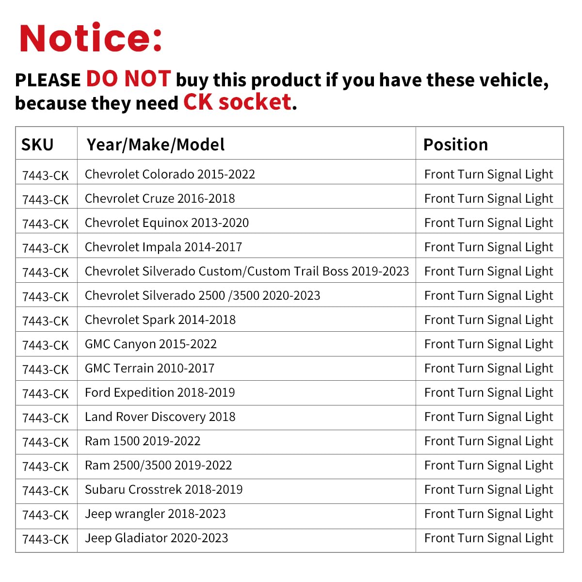 Notice: 1. These 7443 bulbs are polarity sensitive. If the LED does not light up after inserting, simply remove it, flip the direction and reinstall.2.Some vehicles' 7443/7444 dual-filament front turn signal comes with CK circuits, which will need CK bulb, please refer to the last image of CK socket. If your vehicle is listed in it, please search "Lasfit 7444CK ONLY for CK socket" to find the correct bulbs.