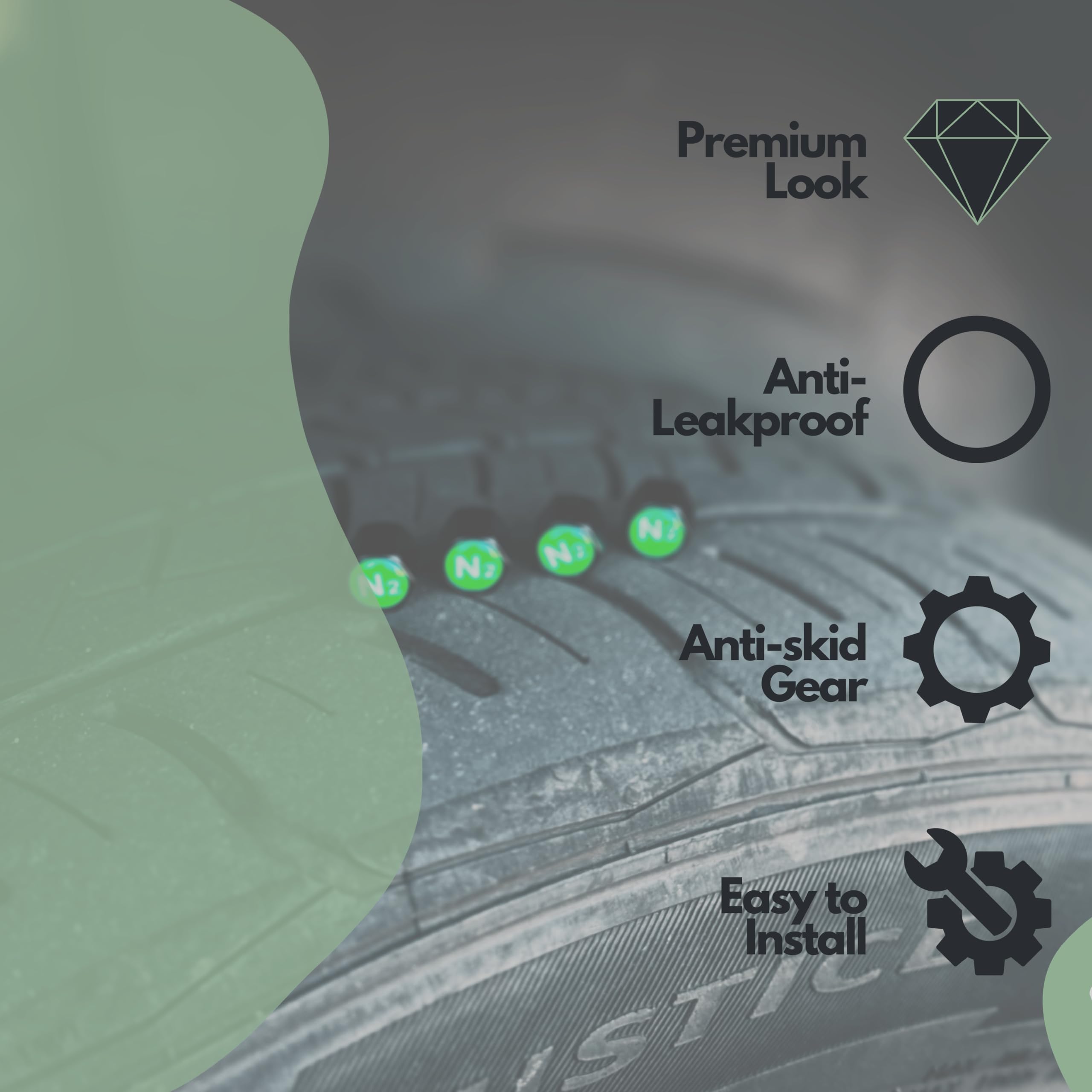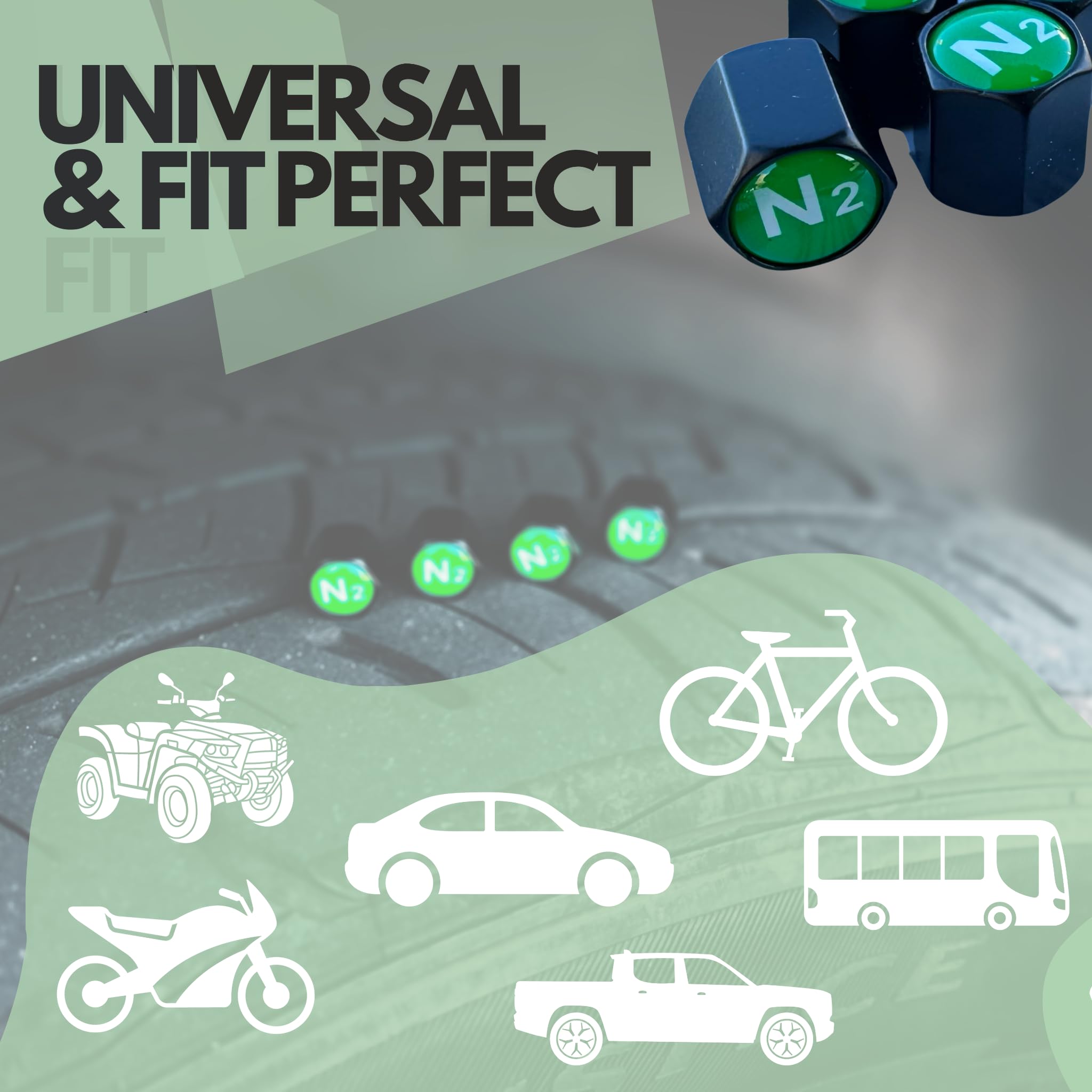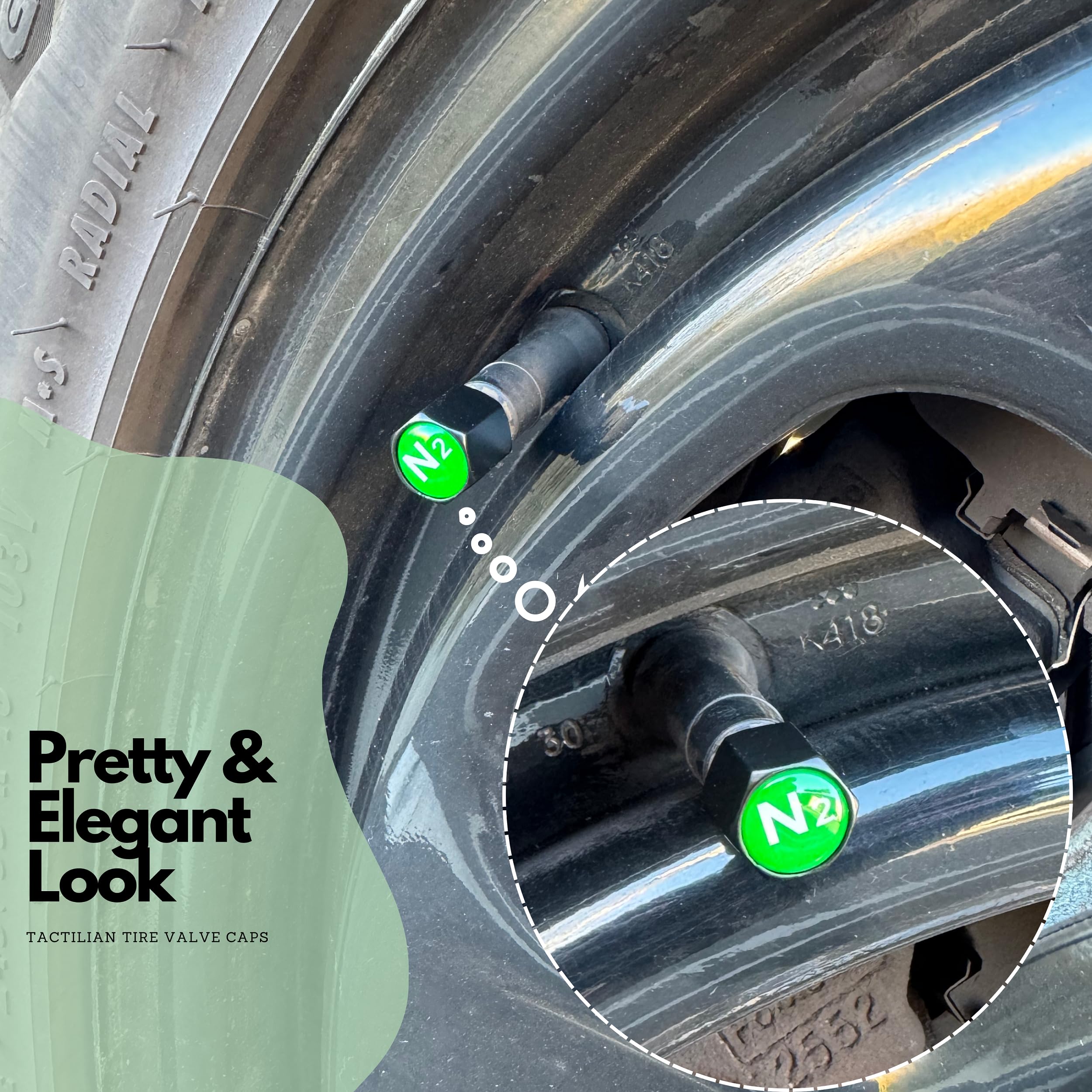 ✔️ ELEGANT DESIGN - Tactilian N2 Sign Valve Stem Caps green have been meticulously designed to safeguard your vehicle's tire valves while maintaining high degree of style and look. Ideal for cars, trucks, suvs, vans, off-roads, RVs, Bus, motorcycles, etc.,