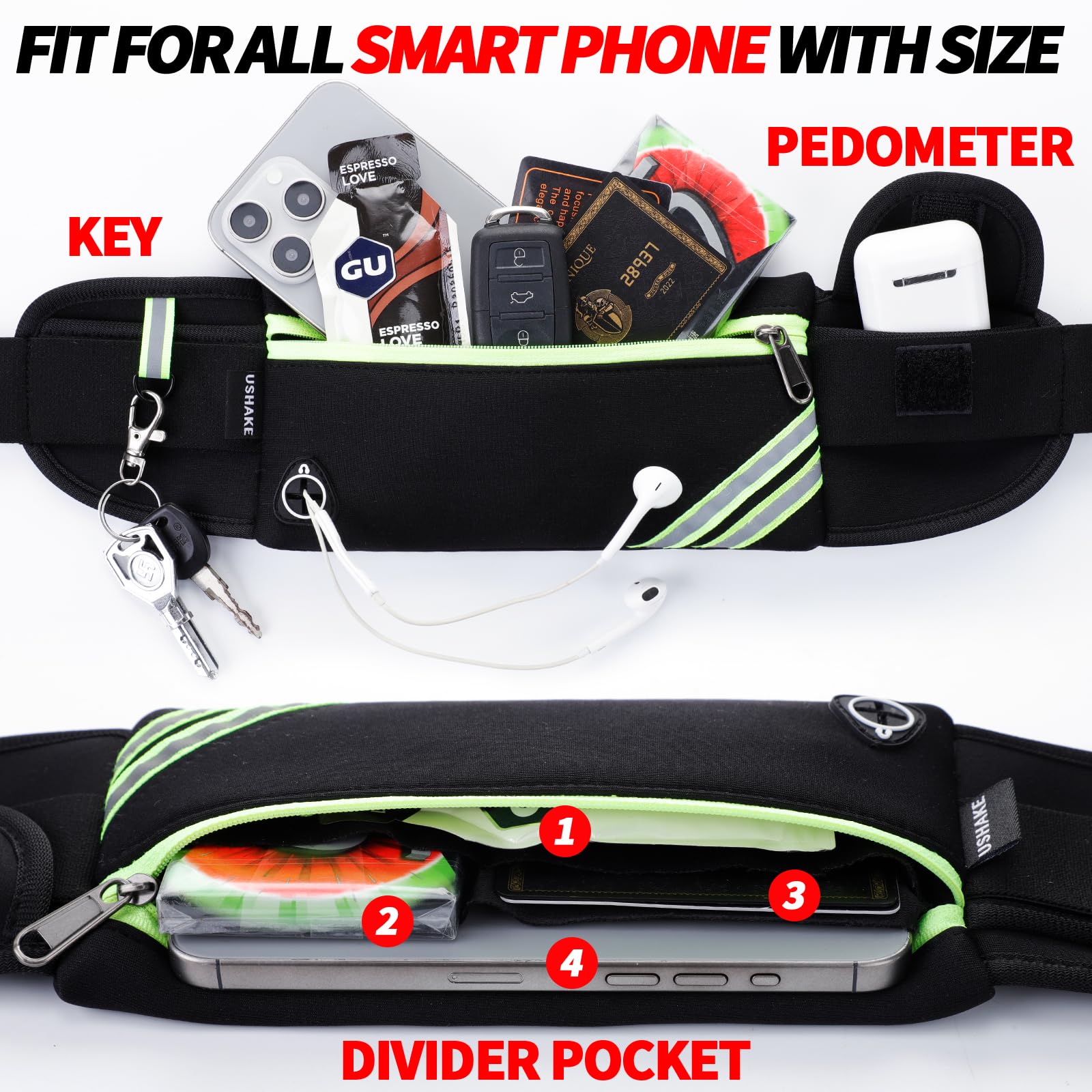 Description Why Choose UShake Running Belt? Here are the Reasons: The pouch is very comfortable to wear and fits most men and women with waist sizes from 27.5" to 43.3". It’s made of high elastic straps that can be adjusted for a perfect fit. This lightweight, durable running belt is designed for your phone, key and cash. The breathable material will keep your body cool, ensuring better exercise experience for you. It will not bounce or chafe during long runs or intense workouts. The plastic zipper design allows you to enjoy a quiet and distraction-free workout. The pouch is compatible with iPhone 6 to iPhone 4 & Samsung Galaxy S6 to S4. Ideal for All Your Active Adventures. Whether you're running, walking, cycling, or hiking, this running belt offers unmatched comfort and convenience. Store your essentials safely and securely and enjoy a quiet adventure with no distracting sounds. Package Includes: 1 * USHAKE Running Belt, Black Lifetime Warranty At USHAKE DIRECT, our first priority is customer satisfaction. Contact us immediately if anything comes up! Get Your UShake Running Belt Today And Make the Most Out of Every Active Adventure! With its adjustable fit and lightweight, breathable design, you'll be able to enjoy all your favorite activities with ease and comfort.