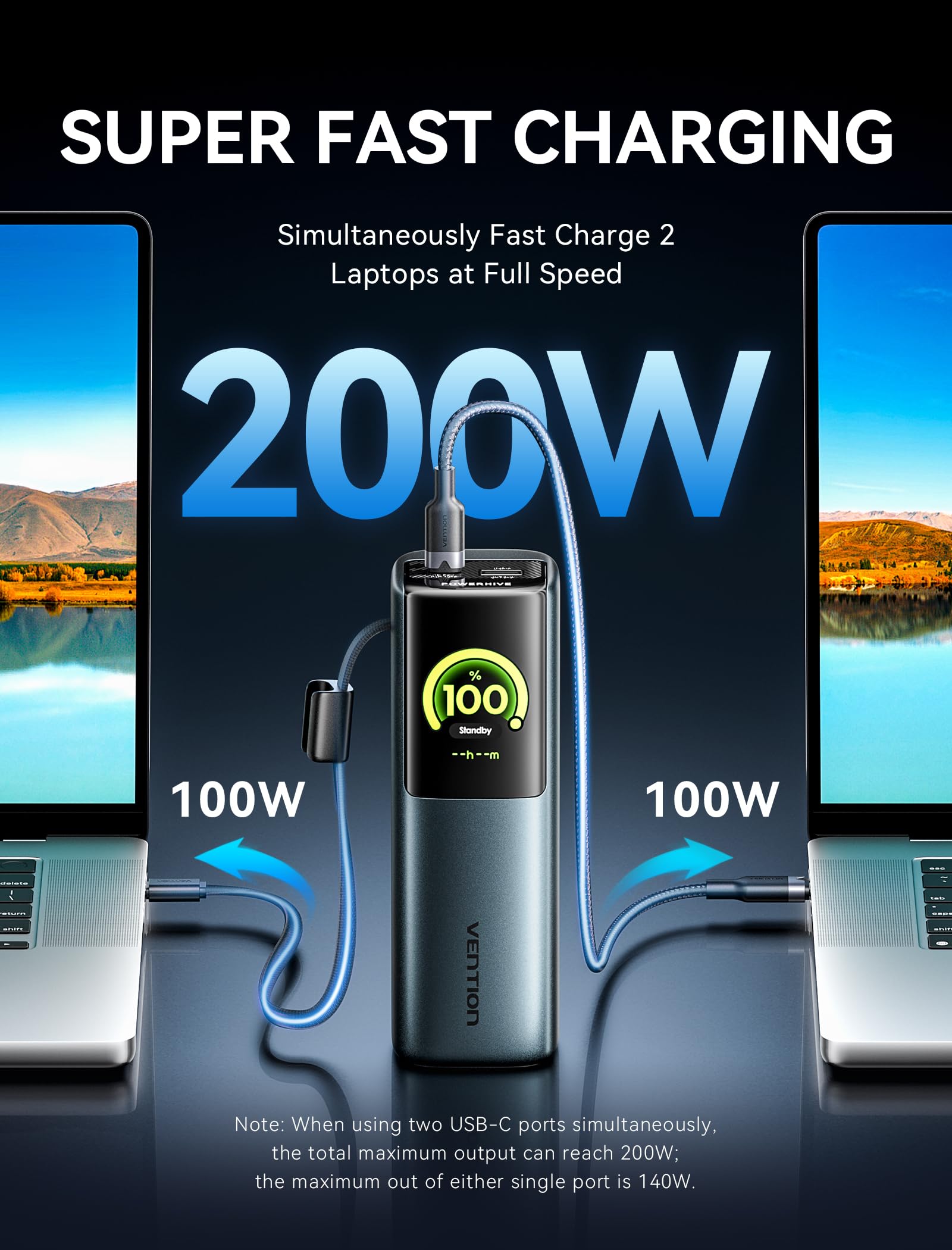 200W Max Output: This power bank with USB-C1 port delivers up to 140 W individually and charges a MacBook Pro to 60% in just 30 minutes. With simultaneous use of USB-C1 and USB-C2, it achieves a total power of up to 200 W - ideal for charging two laptops simultaneously