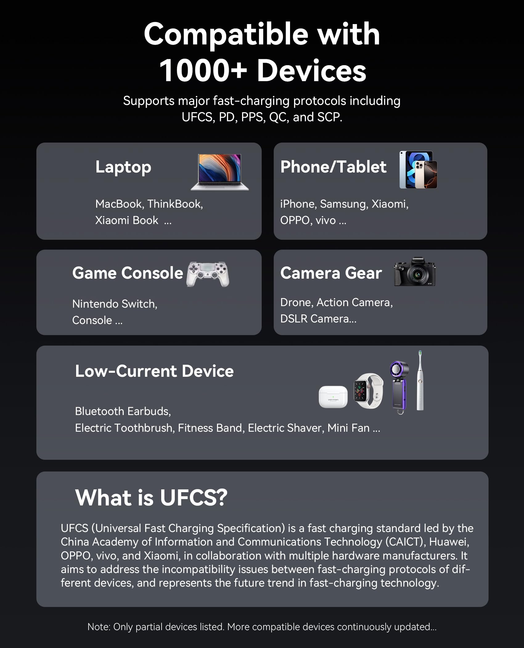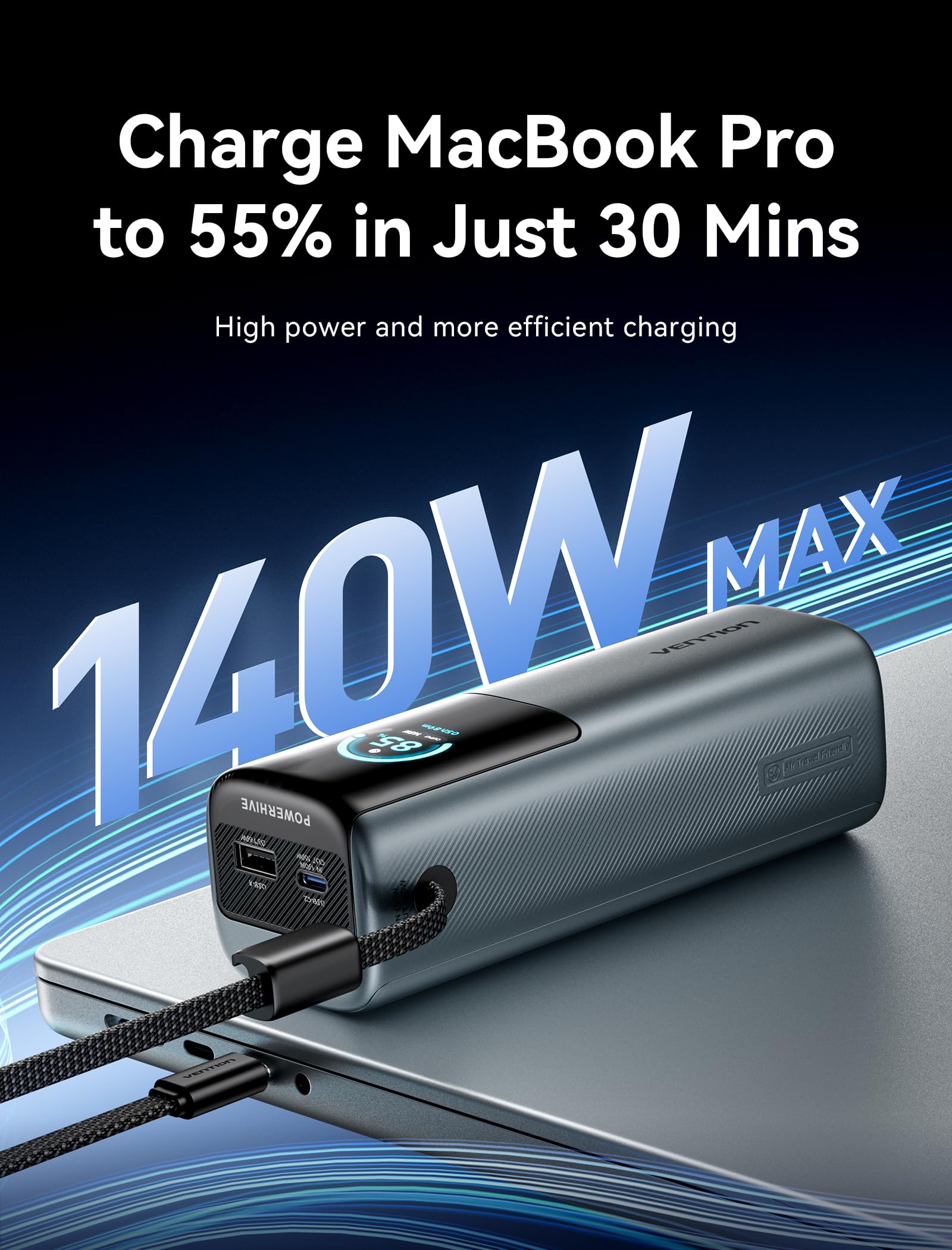All-in-One Universal Fast Charging Solution:Fast Charges Galaxy S25 Ultra 45W, iPhone 16 Pro, iPad Pro & 99.9% of Devices Under 140W, and USB-C1, USB-C2 and USB-A charge laptop, smartphone and headphones at the same time - no waiting time, no multiple chargers required with this USB C power bank ( If you use a third-party cable, please use a compatible third-party cable that supports 5A current and 100W power delivery)