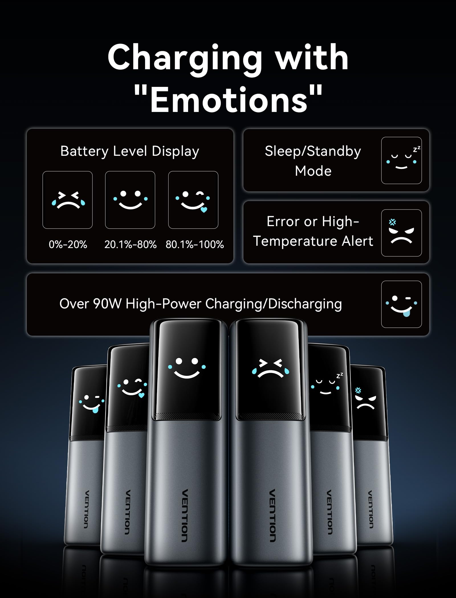 Interactive Emojis Power Indicators:More than a number,this power bank displays animated emojis based on real-time status—like battery level, standby, overheating, or fast charging. It adds fun, tech appeal, and interaction to your charging experience.