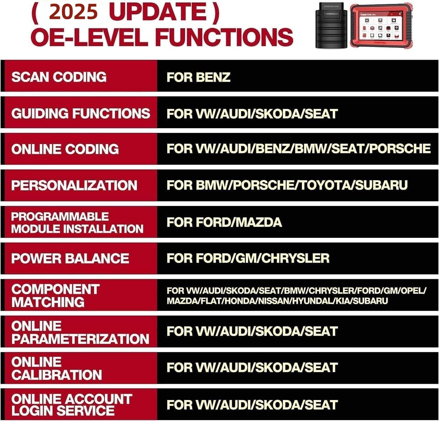 Newest Advanced Thinktool Pro OBD2 Scanner: Comes with powerful OE-Level features. Setting and adaption options for Benz, such as Adblue reset, unlocking the engine after a collision, canceling ABS driving tests, and more. Also perform modifications for BMW, Remap function. customization personalization is available for worldwide vehicles and is continually expanding. Thinktool Pro Can't Online Programming. Check coverage with us before purchase.