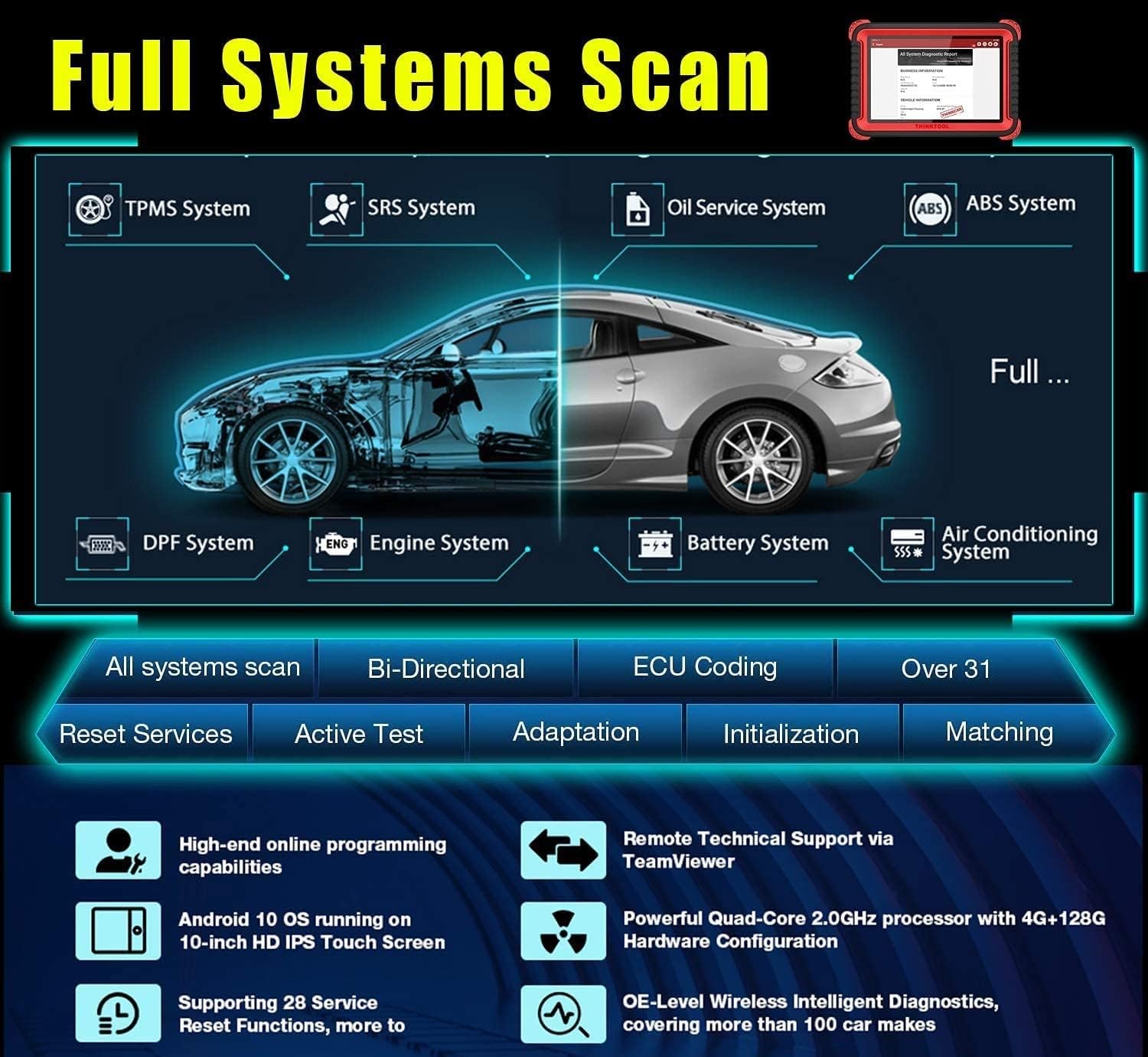All Systems Bidirectional Scan Tool: Thinktool Pro is a professional bidirectional scan tool that is capable of providing valuable remap feature, 31+ reset services. It is designed to work with all vehicle modules/systems and provides active testing of solenoids and actuators.