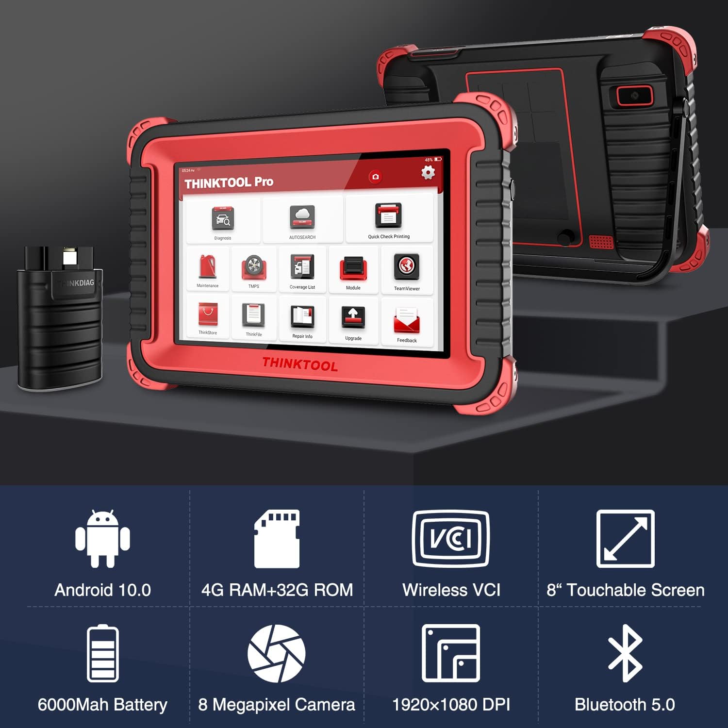 Premium Hardware and Software + 2 Years Update: The latest version of Thinktool Pro equipped with exclusive hardware and software, 2 years update save about 800 bucks. The tool boasts an upgraded Android 10 system, larger 8-inch touchscreen, a 6000mAh battery, expanded 2+32G storage memory.